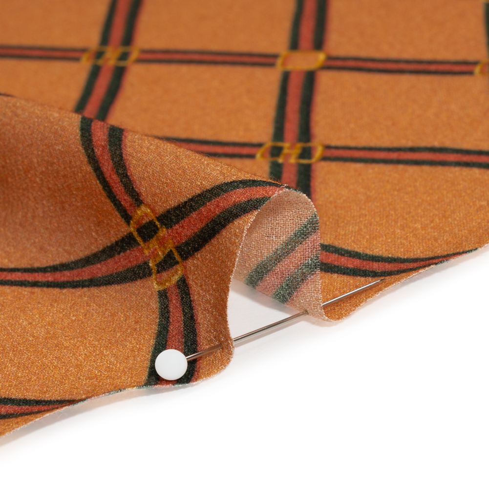 Featuring the luxurious color palette of a statement purse and the golden buckles of a designer bag, our Mood Exclusive Dark Peach Highly Haute Viscose Georgette pulls inspiration from runway-ready accessories! Mauve and greenish-black straps form a lattice pattern against a dark peach background, buckling themselves together with golden clasps. Matte and translucent, this grainy fabric is beautiful as an overlay, paired with a lining, or as a stand-alone sheer garment. From weddings to brunches, cold weather to warm, georgettes cast an ethereal aura over semi-casual and formal occasions. Ideal for layering, pleating, and accentuating your figure, their airy drape inspires romantic gowns, workplace dresses, flowing pants, scarves, and more!