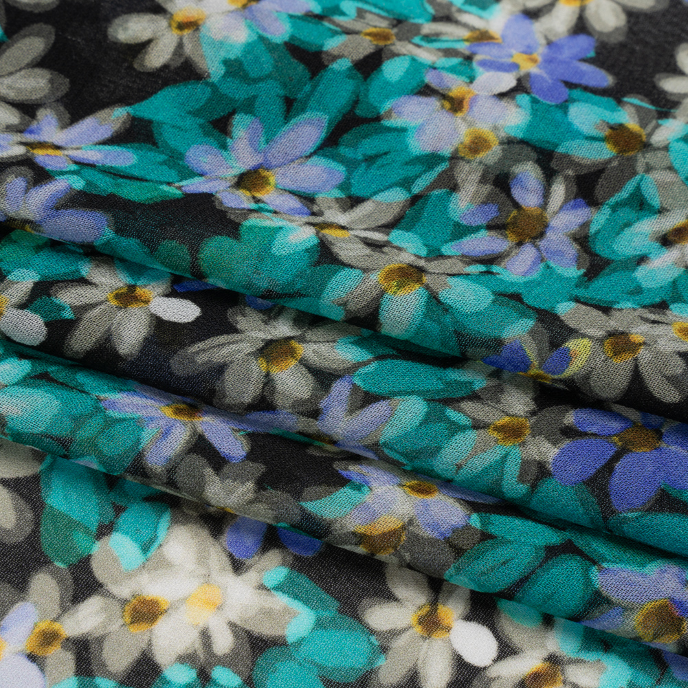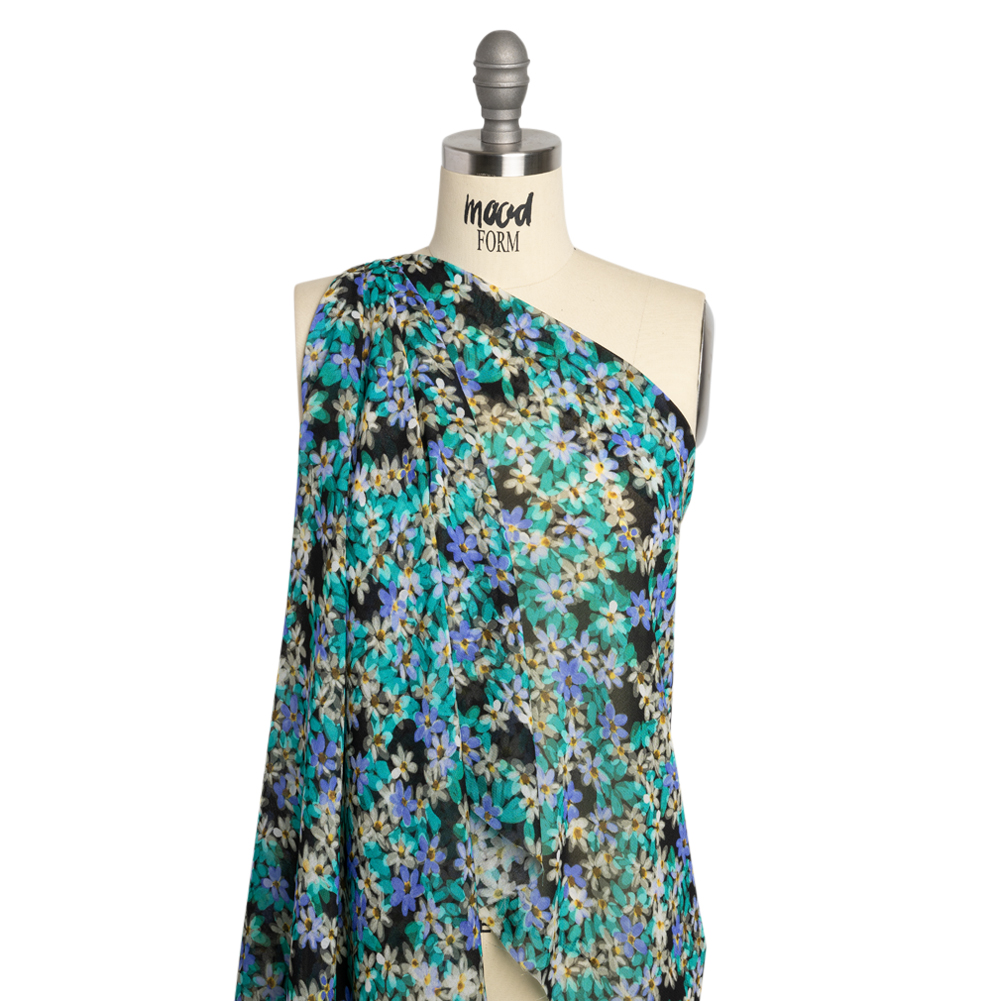 In the sleepy darkness, your head answers only to the calls of the nearby flower bed. Rest your eyes and sigh... our Mood Exclusive Deep Breath Viscose Georgette is a place where design dreams are born. A serene showing of flowers paints the black background in hazy shades of bright blue, white, and periwinkle, textured by a crisp and grainy hand. Made entirely of viscose, this breathable fabric is an affordable route to dressed-up days in gorgeous garments. From a wedding to the office, cold weather to warm, georgettes cast an ethereal aura over semi-casual and formal occasions. Ideal for layering, gathering, and accentuating your figure, their airy drape inspires romantic gowns, workplace dresses, flowing pants, scarves, and more! As it is sheer, a lining may be desired.
