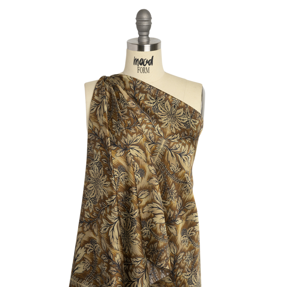 The forest holds a creative energy unlike no other, enchanting our Mood Exclusive Enter Enchantments Polyester Satin Faced Crepe with natural motifs and a spritely luster. An ikat-like background of taupe and light brown streaks resembles the look of wood grain, bringing an organic allure to the leafy arrangements outlined in black. A satin weave gives this crepe a silky-smooth hand while the reverse yields a grainy texture. The supple drape beautifully elevates cowl neck dresses, flowy pants, peasant blouses, and more. Semi-translucent—a lining may be desired depending on the project.