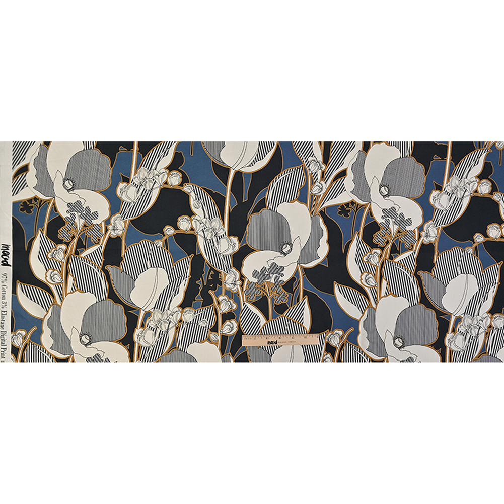 No matter the time of day, this Mood Exclusive Fleurs de Nuit Stretch Cotton Sateen is sure to add a touch of wonder to your outfit! Our Fleurs de Nuit print, which translates to Night Flowers, stems from the navy blue coloration both creating stripes through and shadows behind the print’s bold petals.