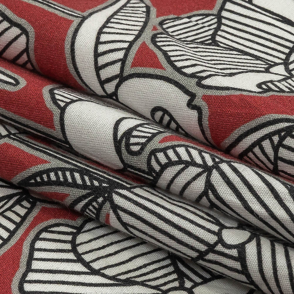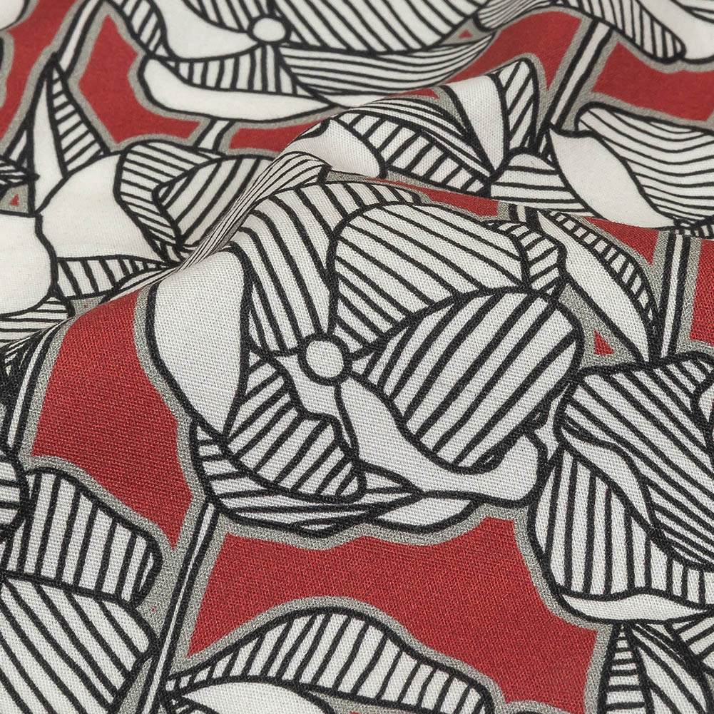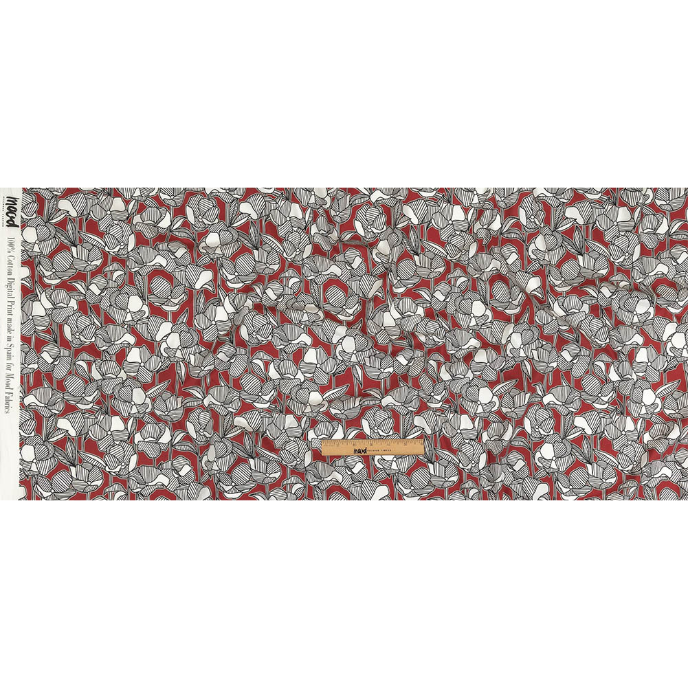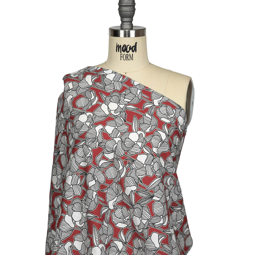 Inspired by long-admired artistic tradition, this Mood Exclusive Floating World Stretch Cotton Poplin is ideal for the aesthetic-minded sewist. Reminiscent of Japanese woodblock prints, graphic black and white flowers float over a berry red ground. A slightly crisp hand, paired with a billowy drape makes it ideal for summer shorts, wrap dresses, or bright button-downs. Mostly opaque in nature, a lining is not necessary but may be used for additional structure or modesty if so desired.