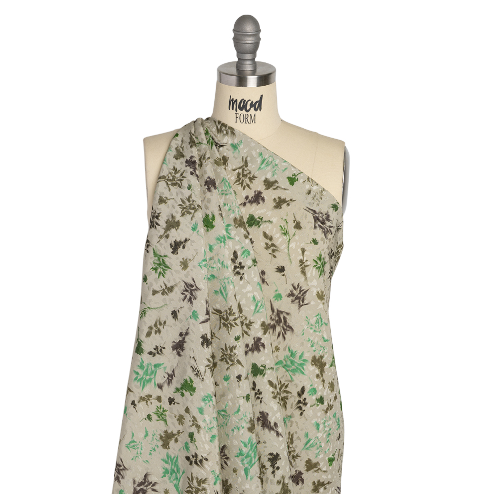 Like the aftermath of a summer storm, hazy green and black branches fall through the sage sky of our Mood Exclusive Forest Serendipitous Saplings Sustainable Viscose Jacquard in subtle pops of color. Raised cheetah spots decorate the background of this eco-friendly fabric, bringing just the right amount of animal print to your formalwear looks. They texture the sleek hand with a subtle dimension, catching the light with an elegant luster as well.Thanks to their complex weave, Jacquards are lauded for keeping the little details in mind as they elevate looks and turn heads. Feeling cool against your skin and falling with a supple drape, this fabric is ideal for dinners in semi-structured blazers and special occasions in dresses. Translucent, a lining may be desired depending on the project.