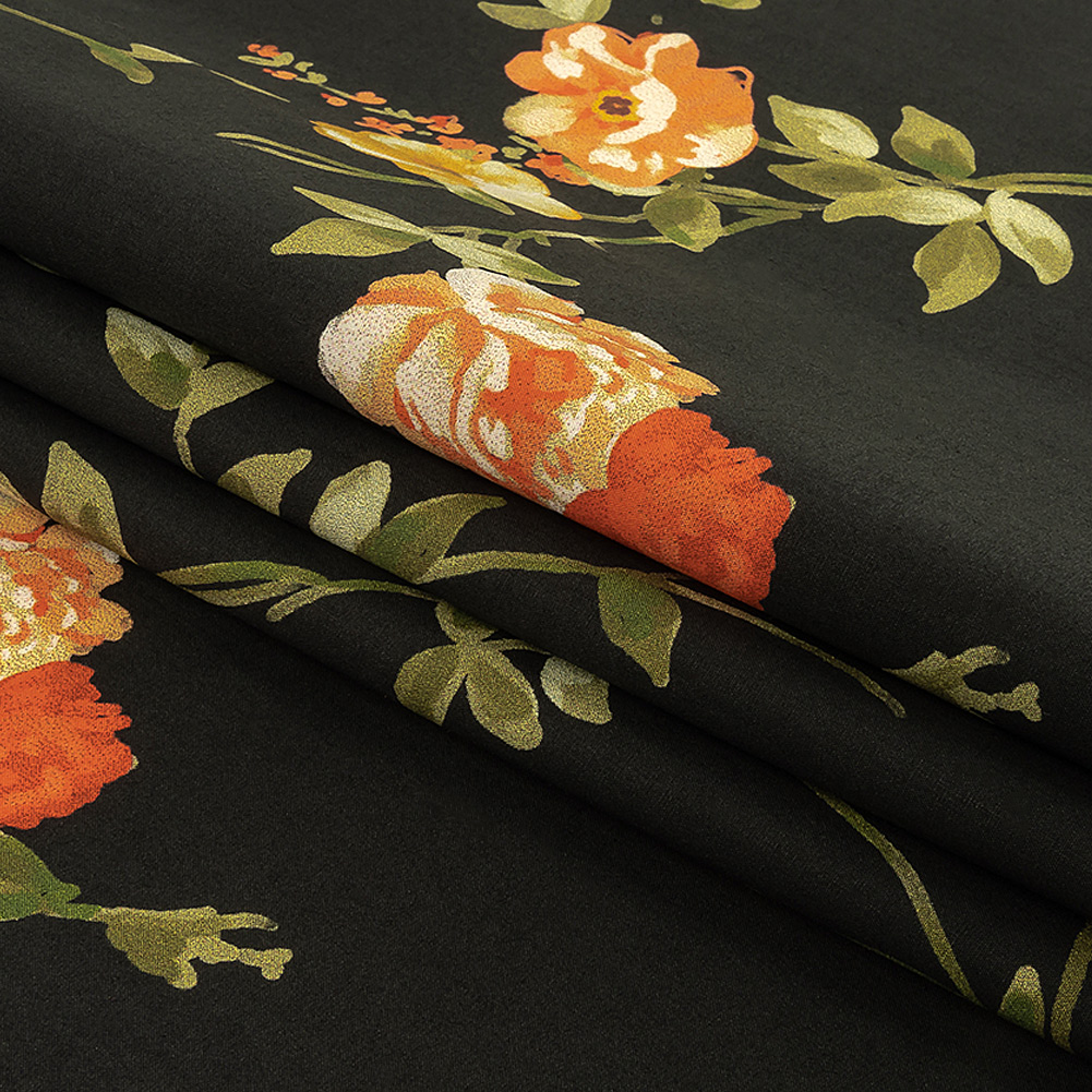 Running through a garden maze at midnight, you never know who—or what—is just around the corner. Regardless, you'll be enchanted by the mysterious blooms surrounding you, exemplified by our Mood Exclusive Garden's Ghost Cotton Poplin. Painterly florals appear as if by magic, bright and luscious against a black background, striking in their shades of red, green, yellow, and white. A smooth, cool hand and a crisp drape meld in perfect harmony, giving life to this lightweight cotton poplin. Due to its mostly translucent nature, a lining is recommended to increase opacity. Consider using this poplin in the warmer months to craft structured summer dresses, as well as breathable paneled shirts or unique button-up shirts.
