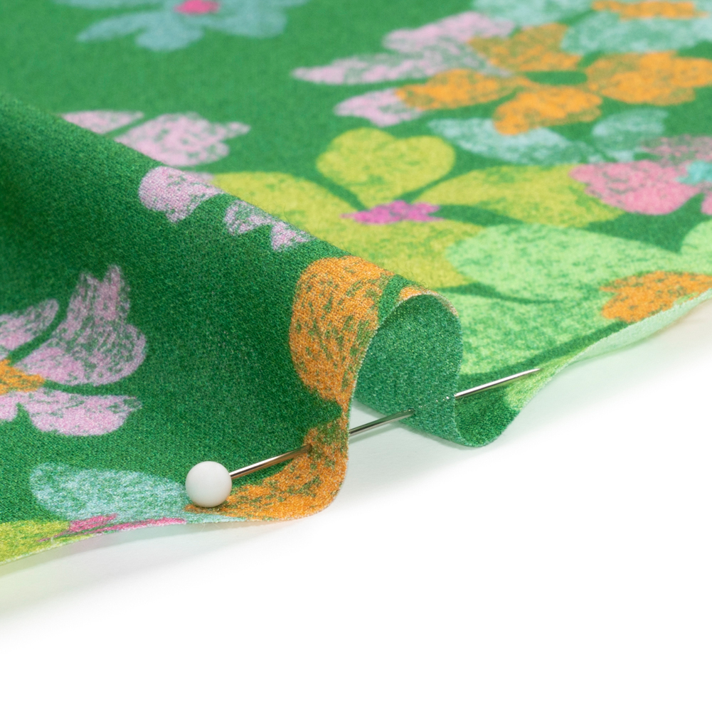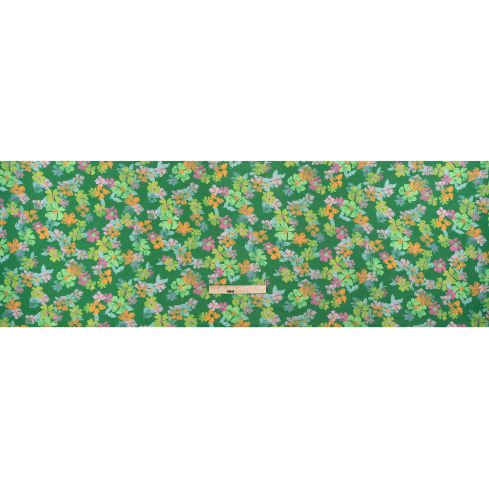 Feel affectionate towards our Mood Exclusive Green Flirt with Flowers Viscose Georgette. Green, orange, blue, and pink flowers look like they've been stamped onto a green background. Georgettes are sheer, lightweight fabrics that create ethereal silhouettes. This specific georgette is made entirely of viscose, yielding a pebbly hand and an airy drape. From accessories to garments, create scarves, blouses, sarongs, and dresses (with or without a lining!).