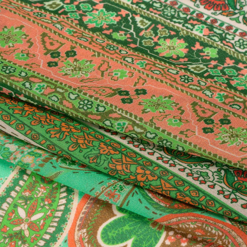 Excite your designs with our Mood Exclusive Green Petals and Paisleys Viscose Georgette! An explosion of paisley and floral motifs throws a party in your wardrobe, coming together on the crisp and grainy hand in shades of lime green, dark green, cream, and orange. Made entirely of viscose, this breathable fabric is an affordable route to dressed-up days in gorgeous garments. From a wedding to the office, cold weather to warm, georgettes cast an ethereal aura over semi-casual and formal occasions. Ideal for layering, gathering, and accentuating your figure, their airy drape inspires romantic gowns, workplace dresses, flowing pants, scarves, and more! As it is sheer, a lining may be desired.Please note: This panel measures 52" wide by 44" long.