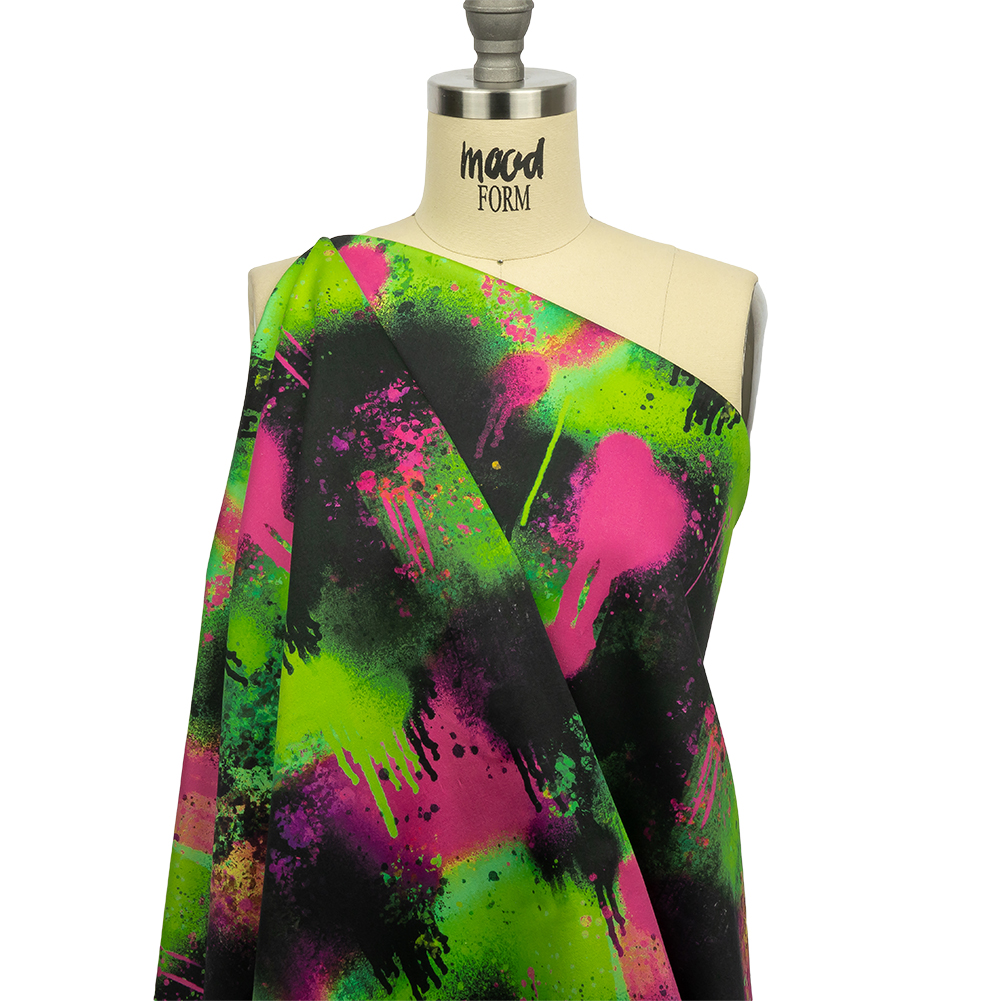 Take your creativity to the streets with this Mood Exclusive Green Street Art Splash Stretch Cotton Sateen. Find inspiration in the vivid pink and green splatters atop a black ground, as though painted right on the fabric with spray paint. Flexible in drape, cotton sateen is prized for its breathable nature. This particular variety is smooth and soft in hand, with a subtle sheen and 10% stretch through the weft. The sewing possibilities are endless; try trousers, dresses, jackets, or structured tops. Swing by our Mood Sewciety Blog to take a glance at over 300 free sewing patterns for more inspiration. For cotton sateen, we recommend the Taro Jumper, Liv Pants, and Avelia Bomber.MoodEarth Verified: BCI, or Better Cotton Initiative, focuses on the exchange of good practices, including economic, environmental, and social concerns, in the production of cotton. For more information on Mood's sustainability initiatives, check out MoodEarth here.