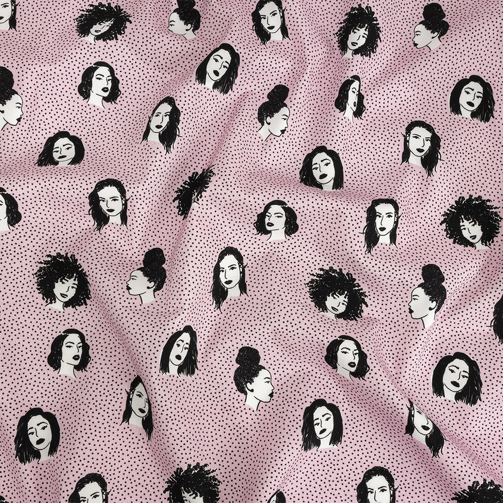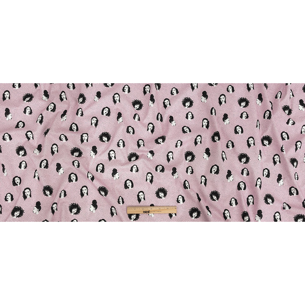 You'll keep singing, "You Can't Stop the Beat" when wearing our Mood Exclusive Hairspray Stretch Brushed Cotton Twill, a slight nod to the 1988 film of the same name. Capturing the essence of the ‘60s, artistically rendered depictions of women with luscious hairstyles decorate the slightly purplish-pink polka-dotted ground. Crisp yet soft in hand, this twill features a notable stretch along the weft. With a malleable, slightly structured drape, craft the perfect pencil skirt with a colorful twist, design a variety of pants with an excellent fit, or create dresses, skirts, blazers, and vests to show off this fabulous print! A lining isn't necessary for opacity but may be desirable to increase comfort or to give your garments a professional look.