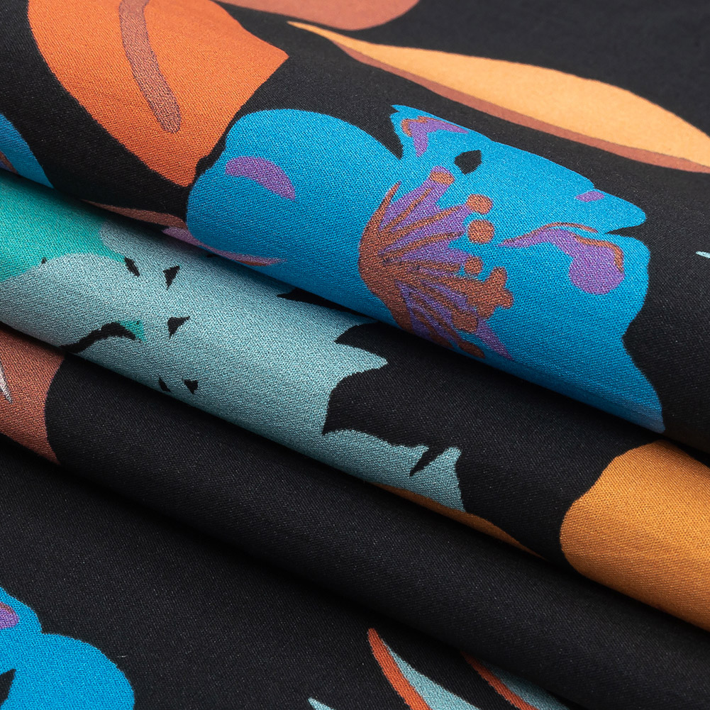 The vibrant shades of our Mood Exclusive Horticultural Hallucination Cotton Shirting are absolutely unreal. Lush blooms and succulent foliage sway and bunch across a black background, a dream of what nature could be. The light, crisp drape pairs with a cool, smooth hand to make this shirting ideal for a variety of summer designs. Craft youthful looks, dream up smart sundresses, or create blouses and shirts, of course! Somewhat translucent, particularly in lighter-colored areas, consider adding a lining both for opacity and structure in some applications.