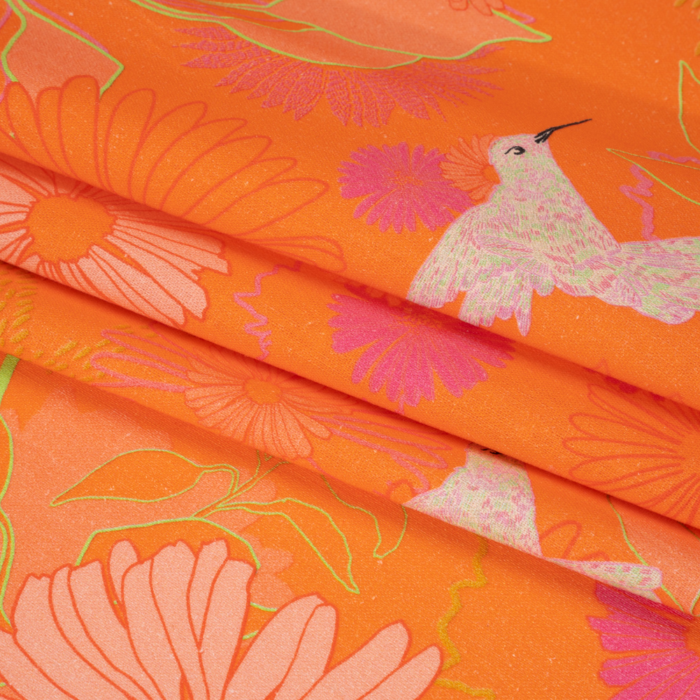 Set your heart aflutter with our Mood Exclusive Hummingbird Heart Linen and Cotton Woven, featuring a garden of hummingbirds and butterflies against a bright orange background. Ideal for heat, linen and cotton separately offer ample moisture absorption and breathability. Together, they blend into the perfect fabric for summer; a relaxed option for sundresses, lightweight blazers, and casual pants. It features a soft face with subtle slubbing and a medium-weight, malleable drape. As it is semi-translucent, a lining may be desired for added opacity.