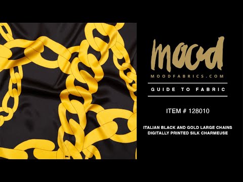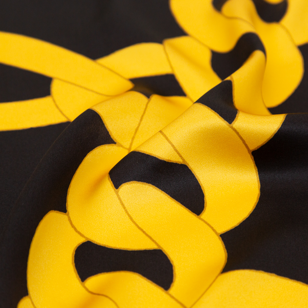 Well, orange you cute! Conjure up a gold medal for best print with our esteemed Italian Black and Gold Large Chains Digitally Printed Silk Charmeuse! Soft and smooth to the touch, this static printed fabric features chain links in various sizes of mimosa-orange intermingling with a black backdrop. No stretch? No problem! Silk has countless benefits, aside from a high luster; from great water absorption and its ability to resist flames to its fiber strength and anti-static properties. A fluid drape and lightweight bring this natural fiber full circle, making it suitable for high fashion usage. Altogether boasting a luxurious quality, this couture-worthy medium is well equipped for drapey silhouettes of few seams, it brings countless options to the table. Opt for formal wear garments, loose blouses, full pants, hi-end lingerie, and more. Translucent, a lining would provide true opacity.