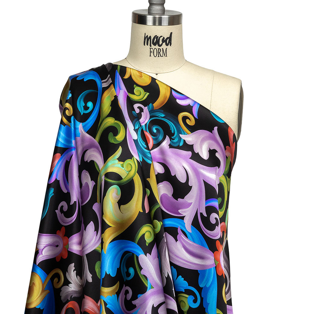 Mood Exclusive Italian Black and Rainbow Ornate Swirls Silk Charmeuse