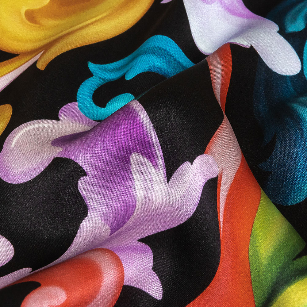 Why wear just one color when you can display all of them sporting our Italian Black and Rainbow Ornate Swirls Silk Charmeuse?! Multicolored classical scrolls dance over a black ground, recalling Rococo aesthetics.