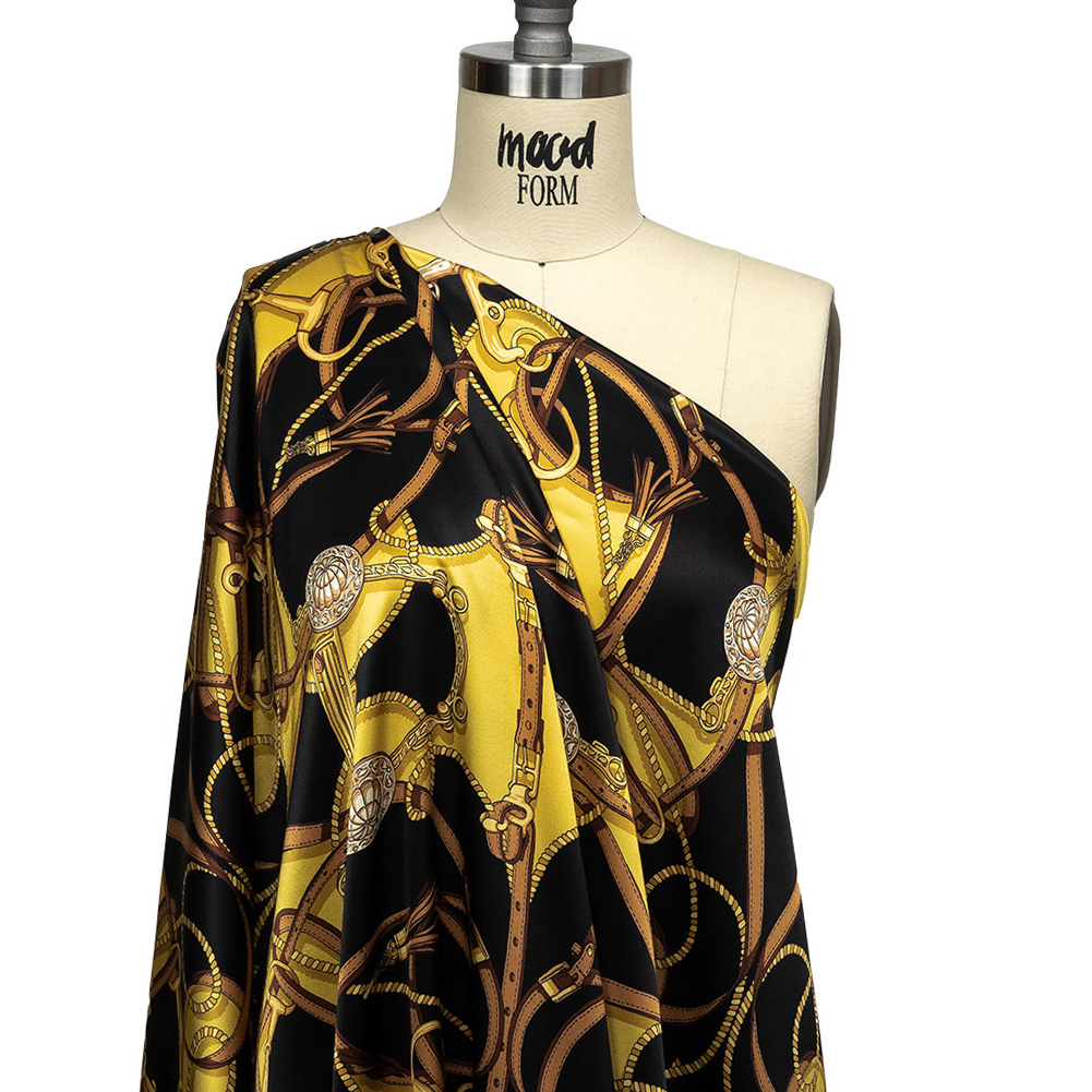 You'll feel like you just won the Triple Crown when you wear Mood's Italian Black, Yellow and Brown Bridles and Reins Silk Charmeuse Panel! Loops of brown bridles and braids display shades of stark black and gold, accented with gold buckles. Fluid and lightweight, this silk charmeuse is of the highest quality, with a smooth, slippery feel adding to its luxurious look. Create slip dresses and bias-cut evening gowns, dreamy lingerie, or effortless dusters. Translucent, particularly with lighter shades, a lining may be added to increase opacity and structure but isn't of necessity.Please note: The dimensions of this panel are 56" long by 53" wide featuring 4 squares within the design.