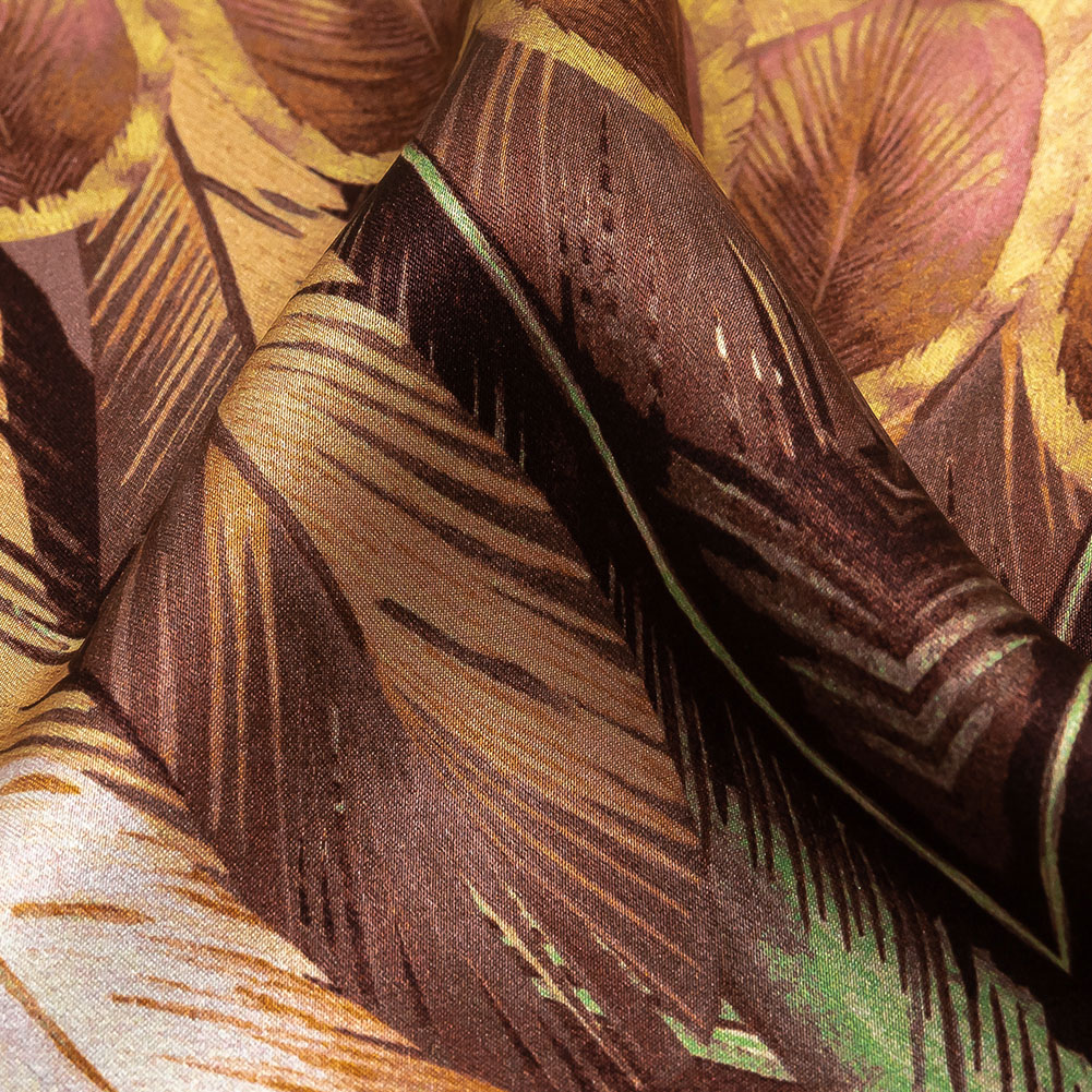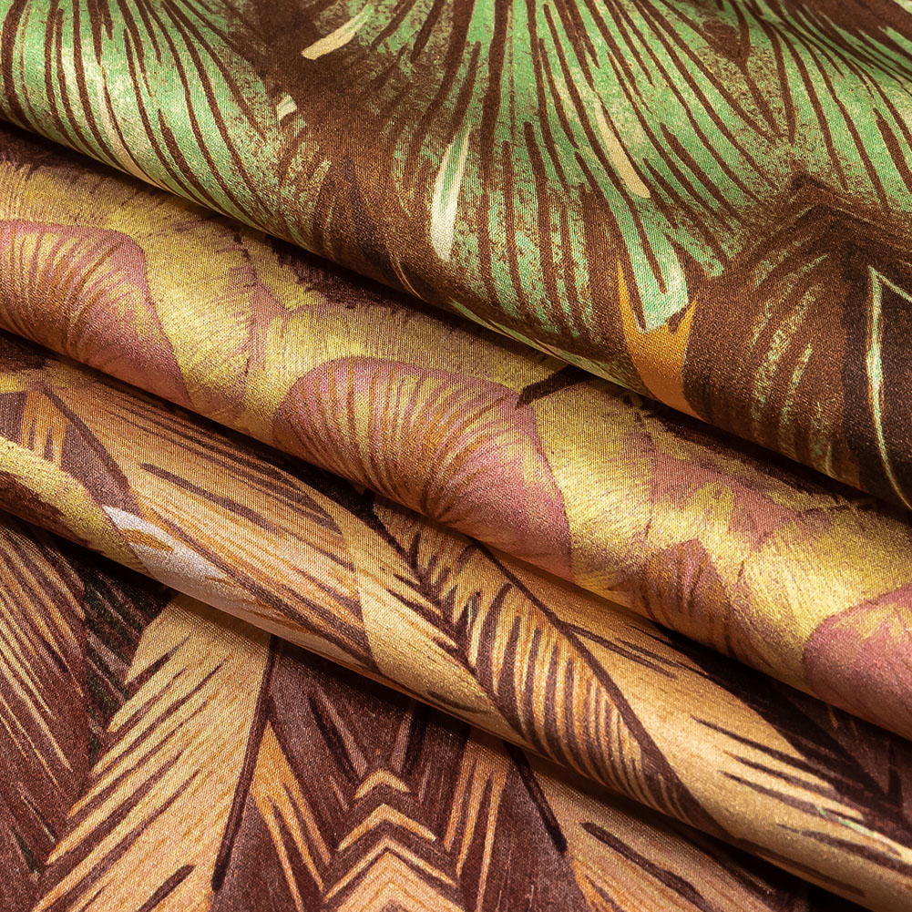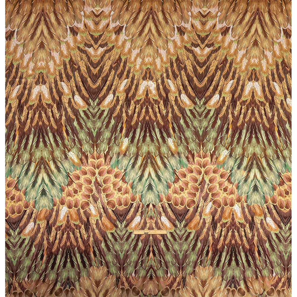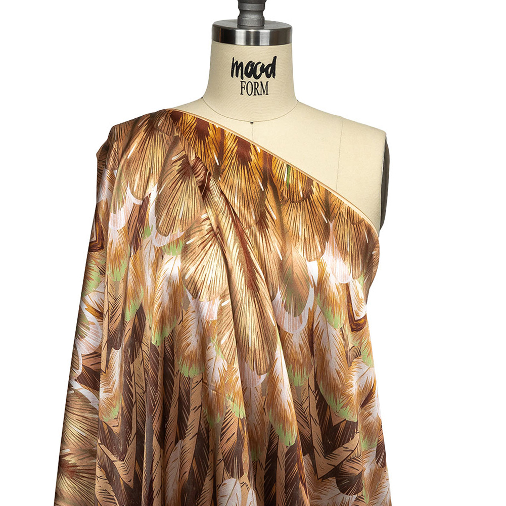 Find your fabulous flock when you wear our Mood Exclusive Italian Cream Blush and Sage Feathered Chevrons Silk Charmeuse Panel! A cluster of creamy blush, light teal and brown peacock feathers effortlessly enchant the eye. Fluid and lightweight, this silk charmeuse is of the highest quality, with a smooth, slippery feel adding to its luxurious look. Create slip dresses and bias-cut evening gowns, dreamy lingerie, or effortless dusters. Translucent, particularly with lighter shades, a lining may be added to increase opacity and structure but isn't of necessity.Please note: The dimensions of each panel are 61" long by 53" wide.