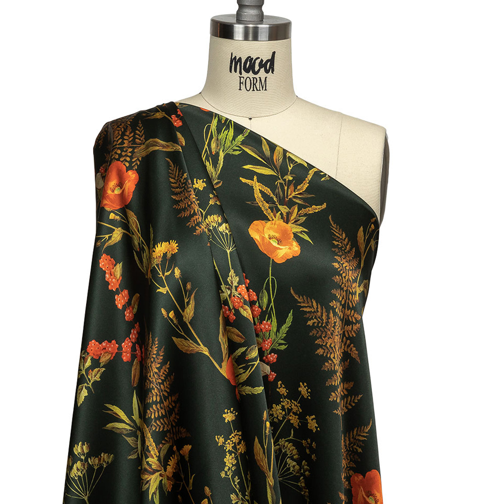 Embrace a cottagecore fantasy with our Italian Kombu Green, Red and Golden Yellow Botanical Silk Charmeuse! A forest green ground blooms with bright red and gold flowers, fronds, and other botanicals. Fluid and lightweight, this silk charmeuse is of the highest quality, with a smooth, slippery feel adding to its luxurious look. Create slip dresses and bias-cut evening gowns, dreamy lingerie, or effortless dusters. Translucent, particularly with lighter shades, a lining may be added to increase opacity and structure but isn't of necessity.