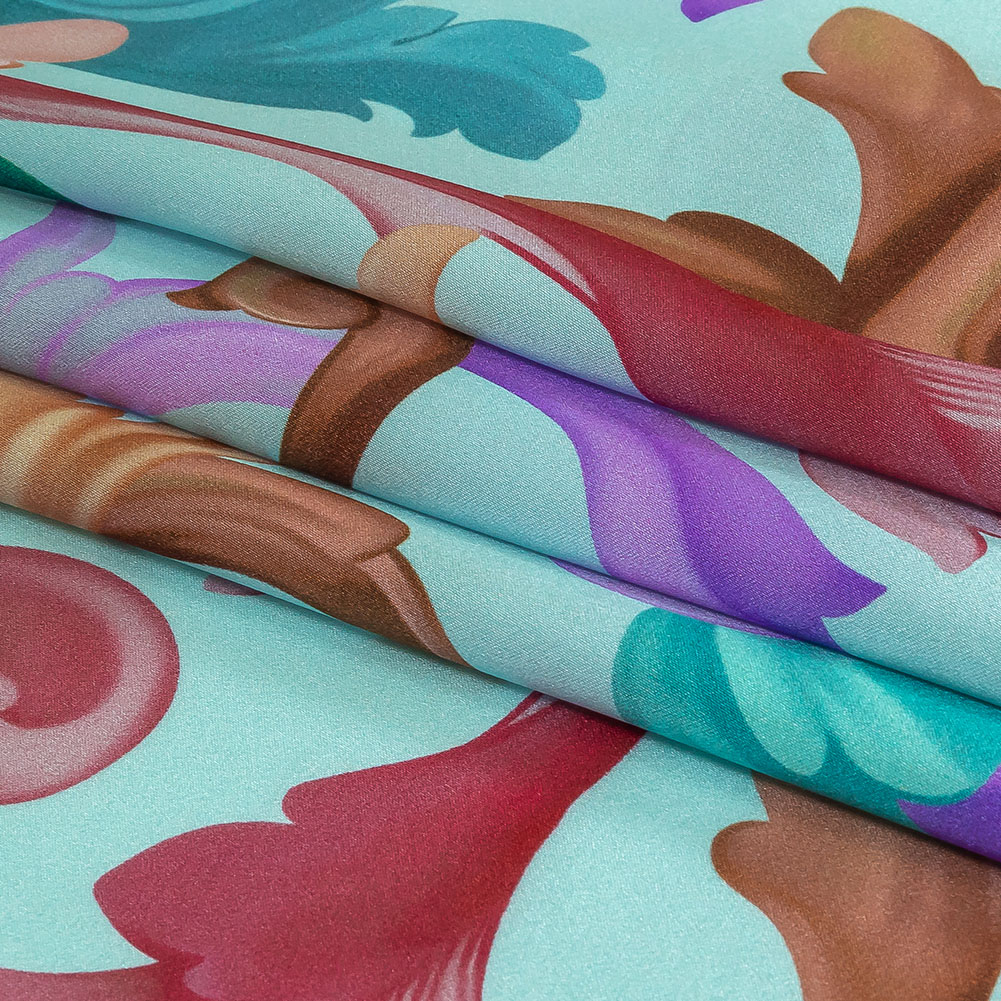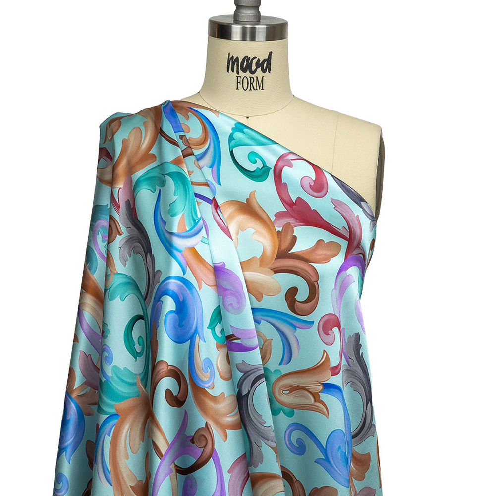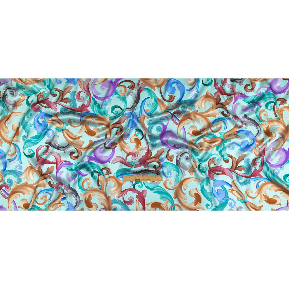 As pastels are having a major moment, try out the color trend for yourself with our Italian Mint and Rainbow Ornate Swirls Silk Charmeuse! Multicolored classical scrolls dance over a minty blue ground, recalling Rococo aesthetics.