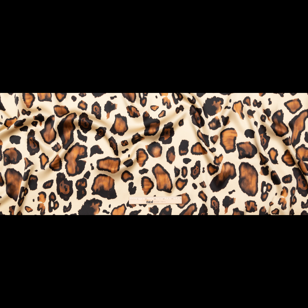 Open sesame! The floodgates open and the race begins, first in line, our Italian Natural and Brown Abstract Digitally Printed Silk Charmeuse! Greeting us with a billowing drape and oh-so-lustrous surface, behind the scenes, this silky-smooth charmeuse has a matte backing that pales in comparison to its digitally printed facing. Exciting one's wild side, the watercolor-like rendering of the jaguar spots feels almost as if we're racing right along with it. Altogether boasting a luxurious quality, this couture-worthy medium is well equipped for drapey silhouettes of few seams—and of a featherweight, it brings countless options to the table. Opt for formal wear garments, loose blouses, full pants, lingerie, and more. Without stretch, it's best to include extra wearing ease in your designs, and strive for those that are loosely fitted. Also, consider layering up this fabric or incorporating a built-in slip to accommodate its translucent construction. We suggest sewing a slip dress with scalloped lace trim, or an over blouse with lightweight shank-back buttons. Try your hand at sewing french seams, or finish straight seams with zig-zag stitches or pinking shears to help prevent the fine yarns from unraveling.