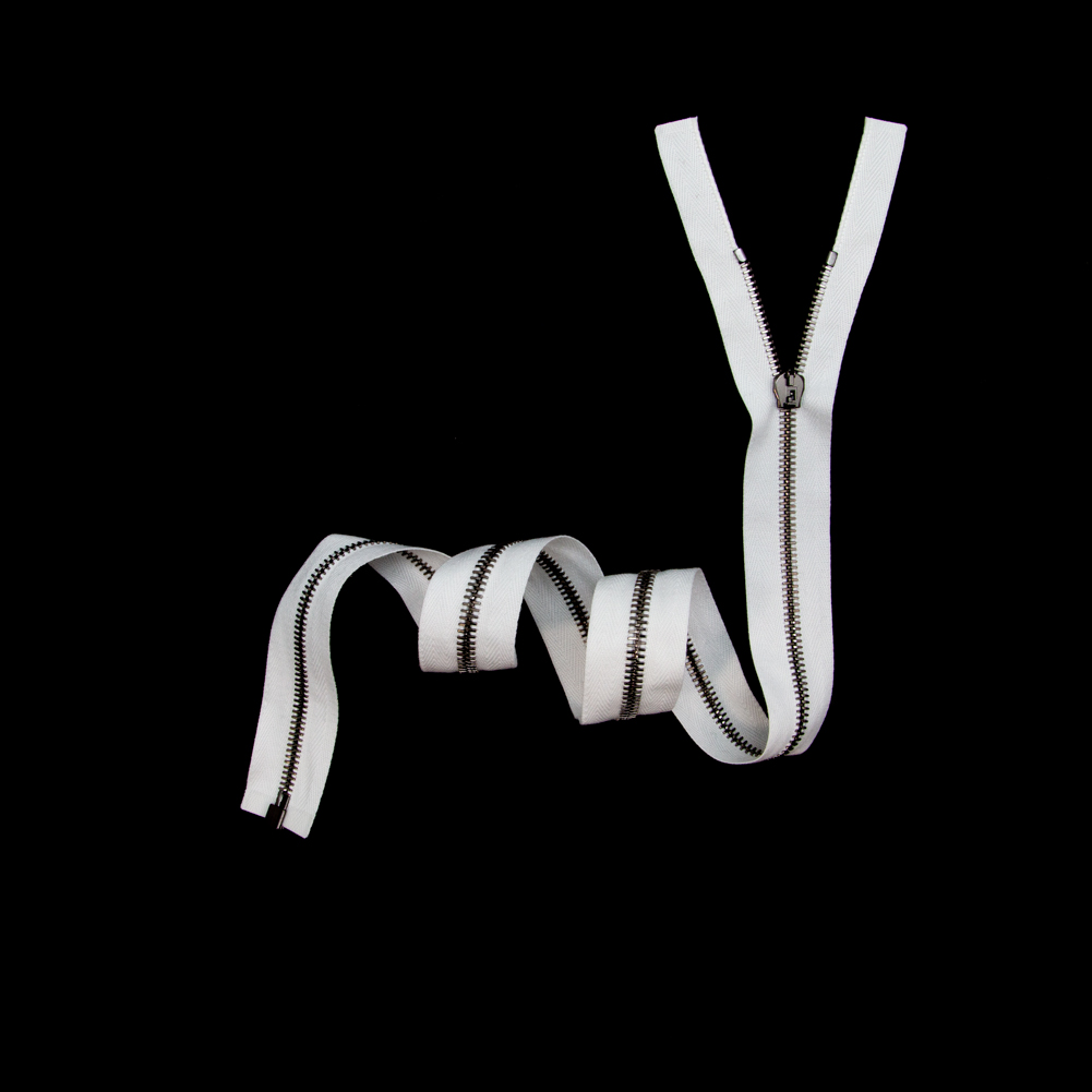 Ready to get down with zippers? Customize your latest creations with our exclusive collection of high-quality mix-and-match zippers! Designed and branded by Mood, this durable Off-White and Gunmetal Open End Metal Zipper was fashionably and attentively produced in Italy. With off-white zipper tape, gunmetal teeth (size 5), and an open end, this 27.5” jewel is exemplary for copious applications! To get started, select a tape with your desired finish and gauge, pairing it with one of our many zipper pulls (sold separately); for attaching the pull, a “spring-loaded clip” is included with the zipper tape. When snapping the zipper pull into place, triple check the orientation is correct, and be certain you're committed to the pairing—as once the spring cap is pressed into place, it is permanently connected and can NOT be changed. For detailed instructions, check out our instructional video above. Our Mood-branded zippers are available in five colors (black, navy, brown, off-white, white); three finishes (silver, gold, gunmetal); three gauges (T3, T5, T8); and two lengths (9”, 27.5”).