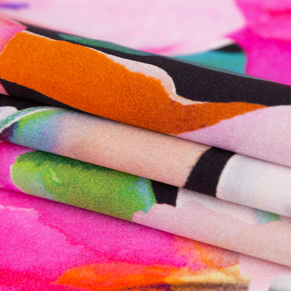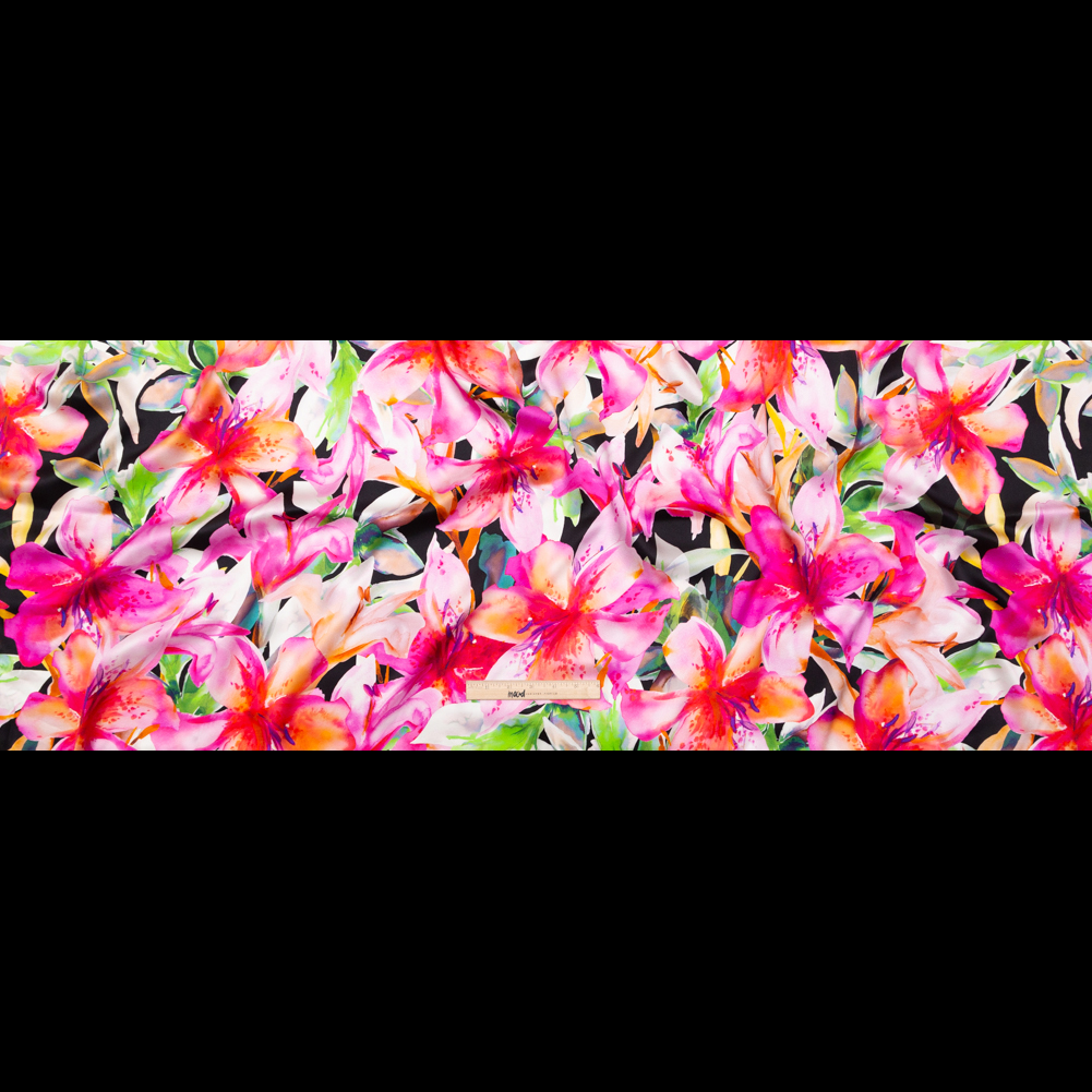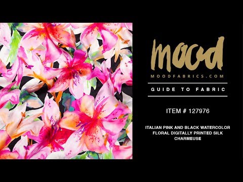 Let the wildflowers in this Italian Pink and Black Watercolor Floral Digitally Printed Silk Charmeuse take your next masterpiece to new heights! Engulfed by a soft hand with alluring silky smoothness, this static-printed fabric favors flowers shone in the dead of night, animating them through its fluid drape. No stretch? No problem! Silk has countless benefits, aside from a high luster; from great water absorption and its ability to resist flames to its fiber strength and anti-static properties. A flowy body and lightweight bring this natural fiber full circle, making it suitable for high fashion usage. Extravagant in every way, this couture-worthy medium is well dressed for drapey silhouettes of few seams; style formal wear garments, loose blouses, full pants, hi-end lingerie, and more. Arrestingly vibrant, yet, teetering between translucent and opaque, consider incorporating a lining for true opacity.