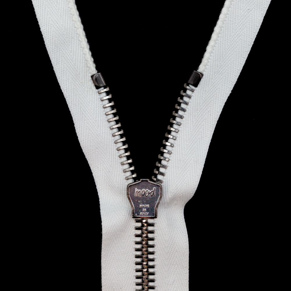 Ready to get down with zippers? Customize your latest creations with our exclusive collection of high-quality mix-and-match zippers! Designed and branded by Mood, this durable White and Gunmetal Open End Metal Zipper was fashionably and attentively produced in Italy. With white zipper tape, gunmetal teeth (size 8), and an open end, this 27.5” jewel is exemplary for copious applications! To get started, select a tape with your desired finish and gauge, pairing it with one of our many zipper pulls (sold separately); for attaching the pull, a “spring-loaded clip” is included with the zipper tape. When snapping the zipper pull into place, triple check the orientation is correct, and be certain you're committed to the pairing—as once the spring cap is pressed into place, it is permanently connected and can NOT be changed. For detailed instructions, check out our instructional video above. Our Mood-branded zippers are available in five colors (black, navy, brown, off-white, white); three finishes (silver, gold, gunmetal); three gauges (T3, T5, T8); and two lengths (9”, 27.5”).