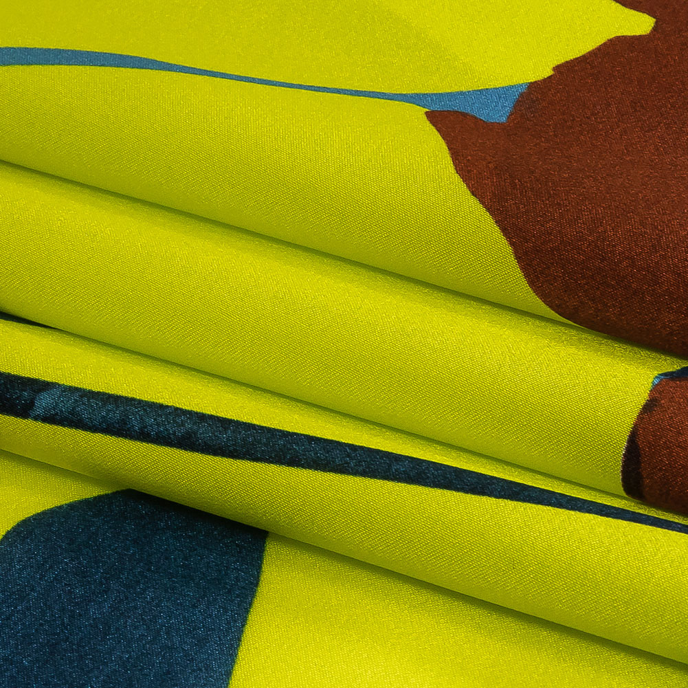 Experiment with draped silhouettes and dynamic colors using our Mood Exclusive Italian Yellow, Steel Blue and Russet Abstract Roses Silk Charmeuse! Against a chartreuse yellow ground, russet red roses are painted with geometric steel blue leaves.