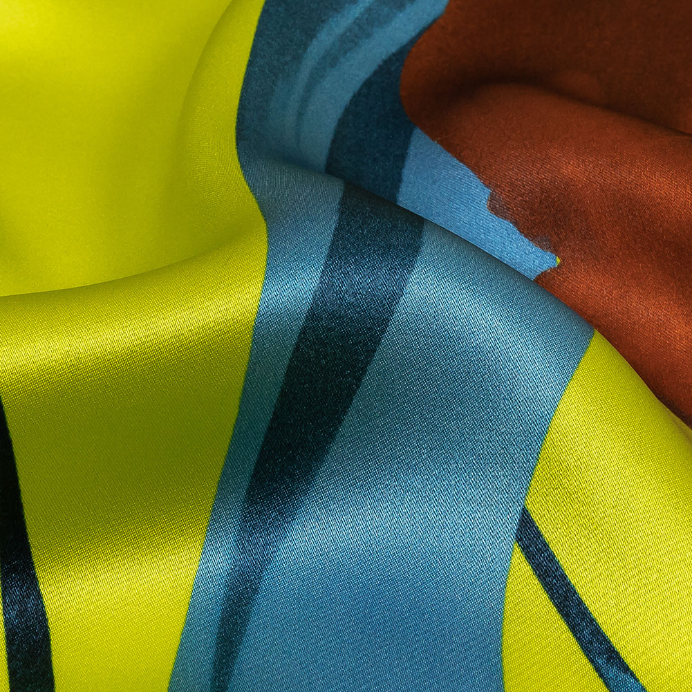 Mood Exclusive Italian Yellow, Steel Blue and Russet Abstract Roses Silk Charmeuse