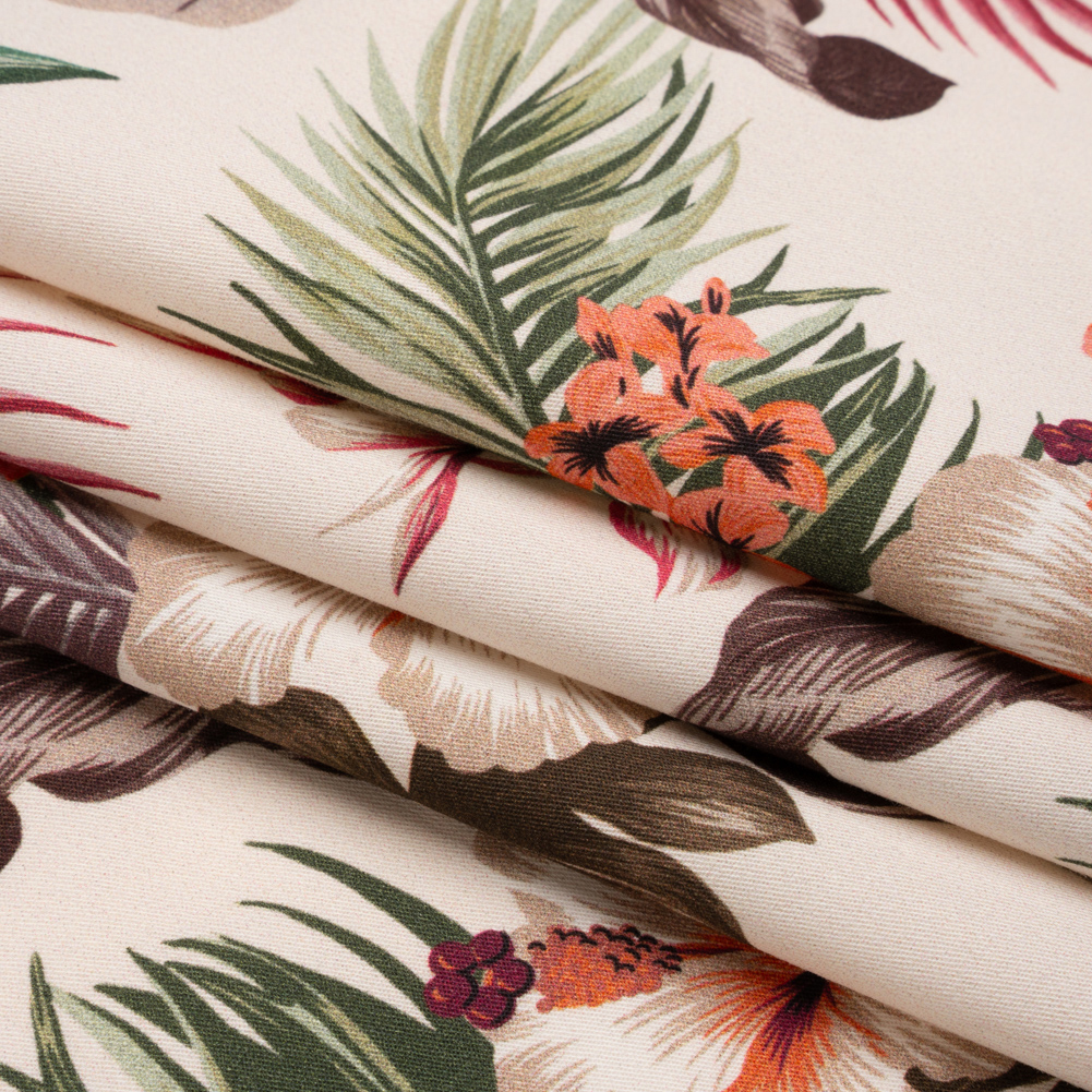 Enter the relaxing realm of a tropical paradise with our Mood Exclusive Ivory Hibiscus Holiday Stretch Cotton Twill! Expertly rendered leaves in shades of green, brown, and magenta bloom in unison with delicate flowers in hues of coral pinkish-orange, golden brown, magenta pink, and grayish beige, all of which decorate an ivory background.