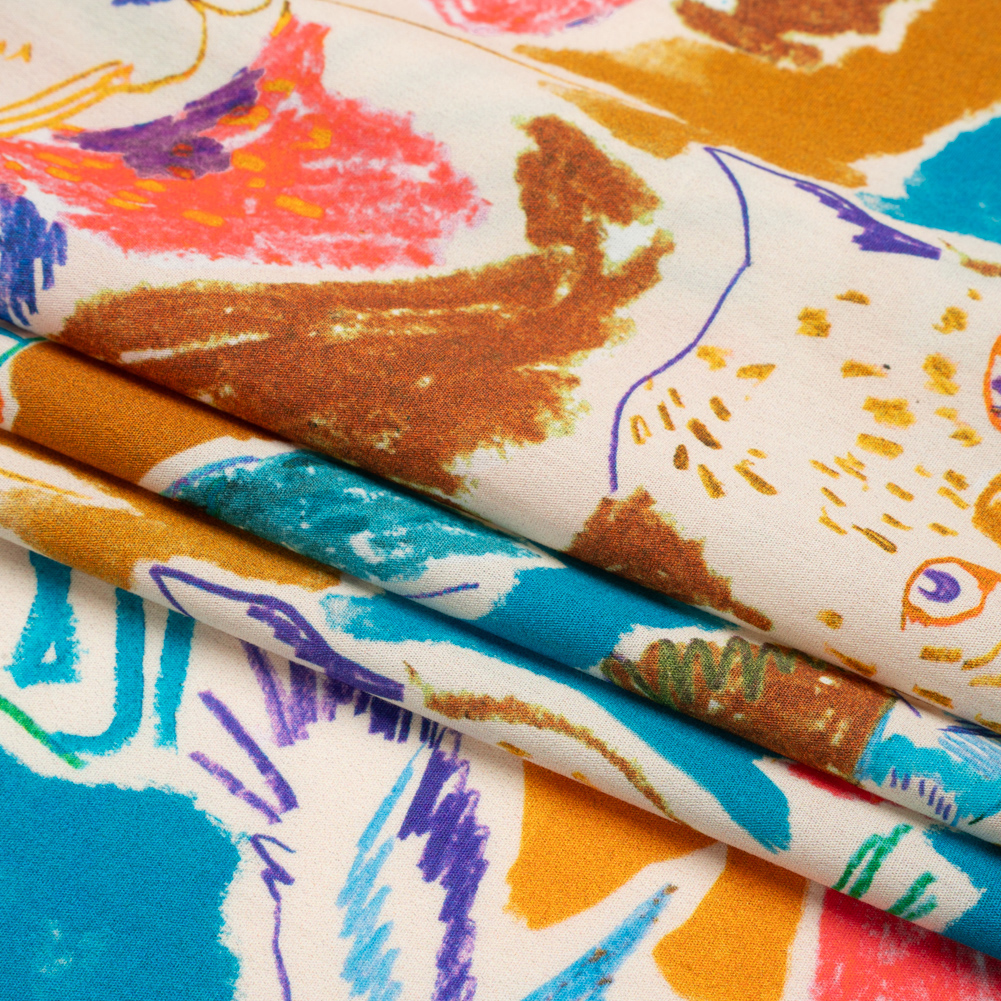Stoic stares and primal pounces take flight on this Mood Exclusive Jungle Draw Cotton Poplin. An animal kingdom expands over a blue, mustard, coral, and tan mosaic background. As if taken from a sketchbook, busts of zebras, leopards, and elephants are peacefully depicted while eagles and foxes dart through the fabric. Thanks to the 100% cotton content, the hand is dry and the drape is crisp. The lightweight and cool feel is excellent for shirting; boxy cropped tops, button-ups, and shirt dresses are just the beginning of what you can create with this fabric! As it is semi-translucent, a lining may be desired.