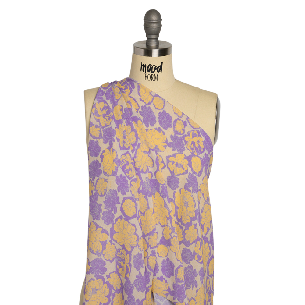 Saunter through our Mood Exclusive Lavender Flowering Floor Viscose Georgette! Pale yellow roses cast purple shadows over a cream flowerbed, surrounded by roses of the same purple color. Georgettes are sheer, lightweight fabrics that create ethereal silhouettes. This specific georgette is made entirely of viscose, yielding a pebbly hand and an airy drape. From accessories to garments, create scarves, blouses, sarongs, and dresses (with or without a lining!).