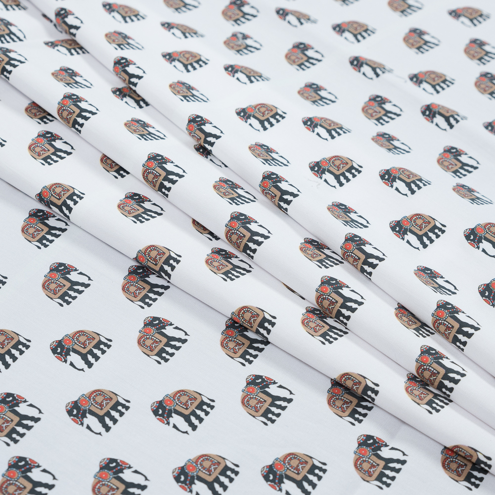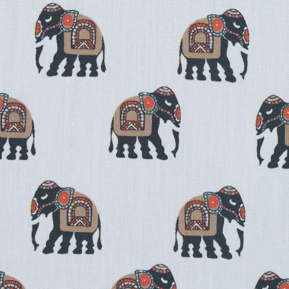 A symbol of strength and wisdom, add our Mood Exclusive Le Cirque Charmant Elephant Printed Cotton Poplin to your collection. Digitally printed Moroccan-inspired elephants scatter across a solid white backdrop for an ethnic appeal. Entitled Le Cirque Charmant, which translates to "the charming circus", these walking elephants are reminiscent of gypsy caravans that move through Europe, filling small towns with excitement and delight as they do tricks and thrill the audience, young and old alike. Even the jaded cities of Paris and Nice find this circus charming. Made in Spain specifically for Mood, its 100% cotton make-up presents a luxuriously soft and smooth hand. Thin and lightweight, add an eclectic flare to your spring and summer mix with shirt dresses, oxfords and tunics. It has a flexible drape to create flared silhouettes and ruffles with ease. Translucent, insert a lining for more opacity.MoodEarth Verified: BCI, or Better Cotton Initiative, focuses on the exchange of good practices, including economic, environmental, and social concerns, in the production of cotton. For more information on Mood's sustainability initiatives, check out MoodEarth here.