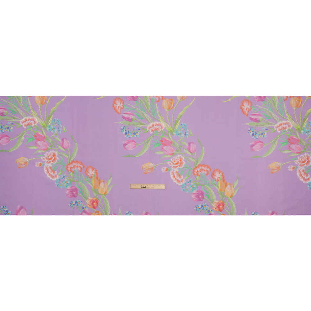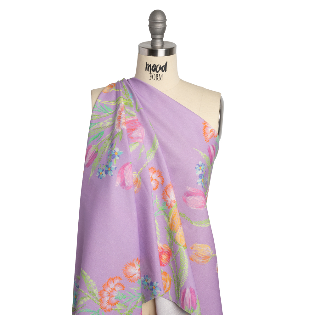 Printed to imitate delicate embroidery stitching, our Mood Exclusive Lilac Stitch by Stitch Linen and Cotton Woven transfers the rebirth of flowers into art. Orange and pink tulips, red carnations, and blue daisies grow from bright green stems, diagonally blooming across a light purple background. Ideal for heat, linen and cotton separately offer ample moisture absorption and breathability. Together, they blend into the perfect fabric for summer; a relaxed option for sundresses, lightweight blazers, and casual pants. It features a soft face with subtle slubbing and a medium-weight, malleable drape. As it is semi-translucent, a lining may be desired for added opacity.
