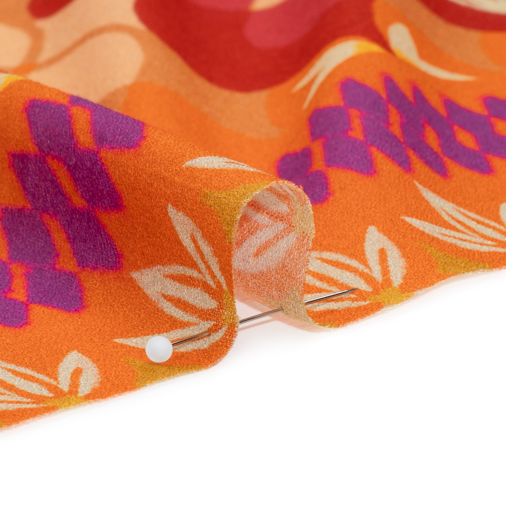 Engaging, dynamic, and sweet, our Mood Exclusive Master Maple Cotton Crepe is a style specialist. An autumnal color palette welcomes design ideas with open arms, decorated with white flowers and displaying a wavy pattern of red, orange, purple, and brown. Thanks to the 100% cotton content, this lightweight crepe is comfortable and breathable, bringing a soft, grainy texture to semi-formal and casual wear alike. Its airy drape creates flowy blouses, button-ups, dresses, and more! Because of its transparency, a lining may be desired. Please note: This panel measures 53" wide by 38" long.