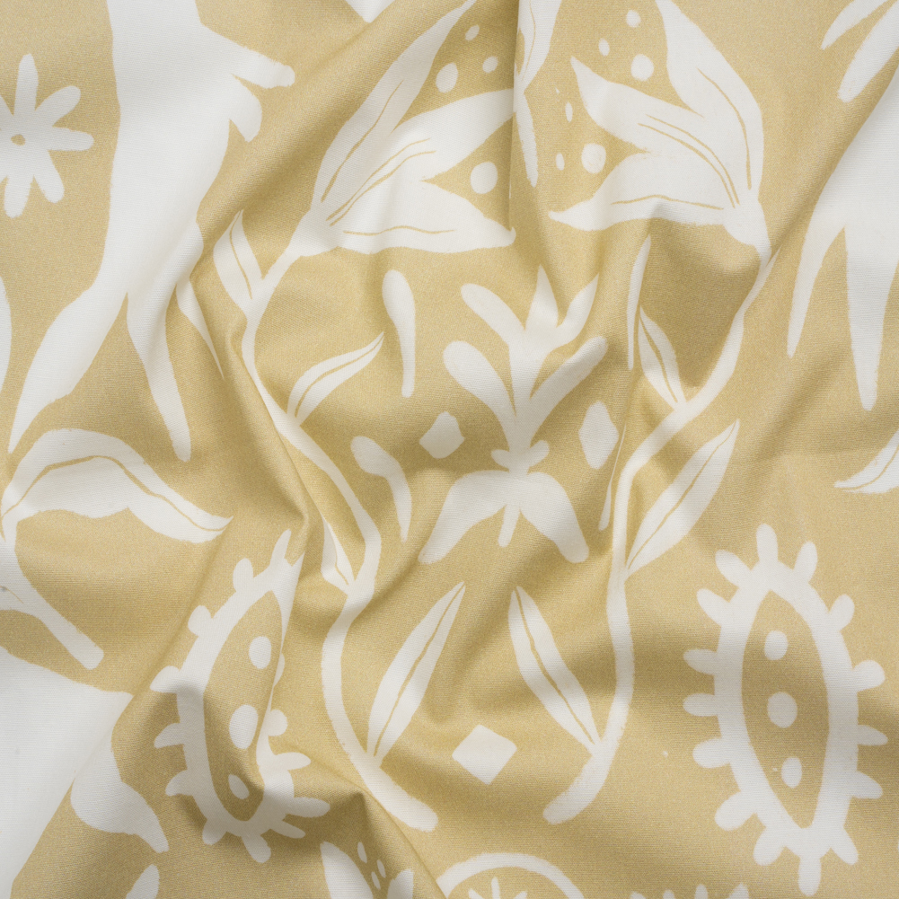 Emerge at the edge of a forest where horses dance freely, furry friends hold town hall meetings, and flowers sing untrampled. Unbothered by civilization, our Mood Exclusive Mayor Dahl Stretch Cotton Poplin cultivates a simple life. In a folk-art style, white silhouettes of prancing horses, fantastic foxes, butterflies, flowers, and leaves cover a beige background. We’ve never met a cotton poplin we don’t love! Your wardrobe agrees: poplin is a staple in most closets as its dry hand and malleable drape create quality garments for every age, gender, and event. With the addition of a 25% weft-wise stretch, this specific poplin allows you to move comfortably in pedal pushers, boxy midriff tops, or chic shirt dresses! While mostly opaque, a lining will increase modesty and add structure to accomplish your desired silhouette.
