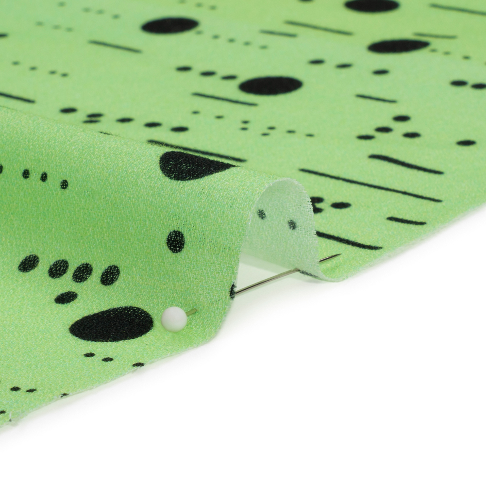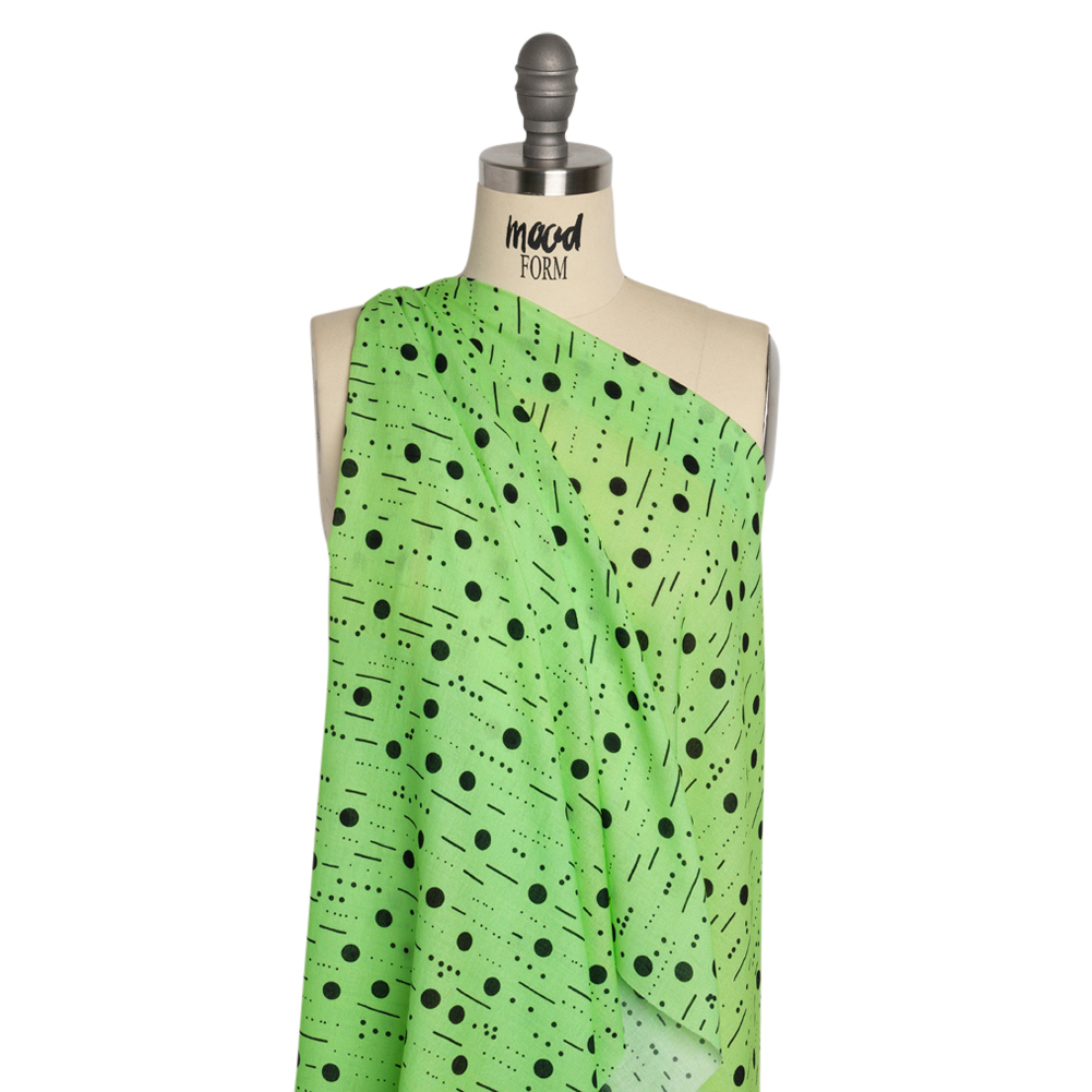 The simplicity of our geometric Mood Exclusive Mint Dot-Dash Decode Cotton Crepe won’t fail to communicate your creativity to the world! Black circles, both large and small, are arranged among short and long dashes, reminiscent of the innovative communication methods used in Morse code and Braille.