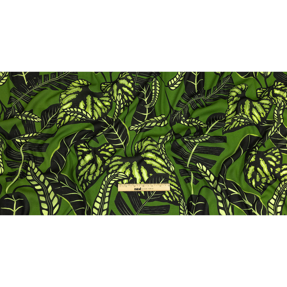 As if leaping from the pages of a storybook, our Mood Exclusive Mowgli's Magnificence Viscose Georgette will whisk you to a whole new world of style. Grand leaves float over one another in black and celadon green hues, all on a jungle green ground. A cousin to crepe, georgette bears a pebbly, airy hand, with a fluid, easy drape making luxurious looks effortless. Try shirred blouses, vintage-inspired sundresses, or flowing dusters. Sheer, we suggest a lining for extra structure and modesty.