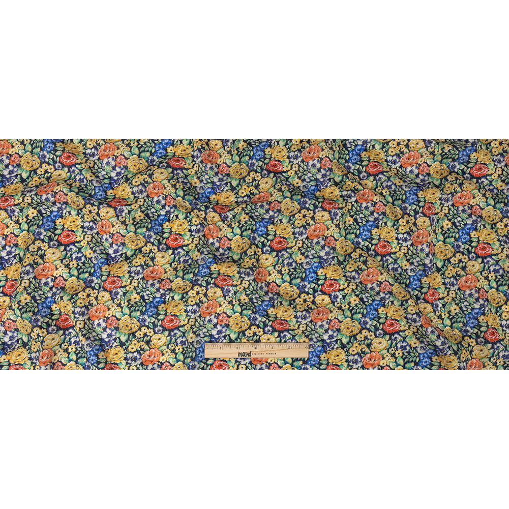 Boundless buds bloom and blossom in a colorful array across our Mood Exclusive Navy Bountiful Blossoms Cotton Voile! This breezy fabric features a crowded garden of golden yellow, coral pink, orange-red, indigo purple, and cobalt blue flowers that bloom under a midnight navy blue sky. Treat yourself to this exceptional voile with a very slight sheen, which promises a cool, dry hand and a thin, lightweight construction. With a billowy, airy drape, this fabric is incredibly breathable, making it an excellent choice for warm-weather garments such as printed circle skirts, playful summer dresses, and youthful billowing blouses. Mostly opaque, a lining may be desired for additional opacity or structure depending on its application.