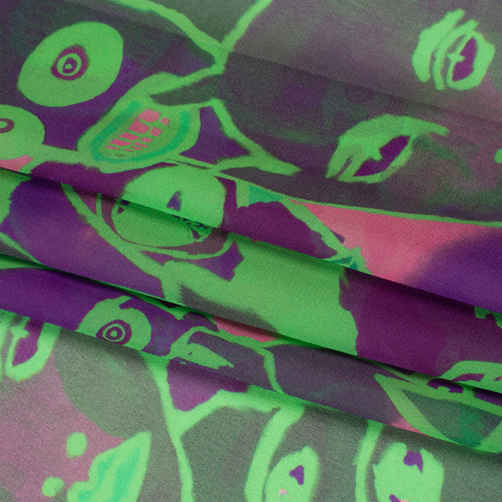 Our Mood Exclusive Neon Green Nefarious Fiends Viscose Chiffon is a ghoulish rave of color and fear. Nosferatu and company appear like a hallucination in neon shades of green, purple, and pink. This 100% viscose fabric has a grainy feel that, along with its translucent and lightweight nature, is a characteristic of chiffon. The airy drape flirts with the breeze, romanticizing silhouettes of formal and semi-casual wear alike; create overlays for long gowns and pleated skirts, pair with a lining to create opaque blouses with sheer puff sleeves, and more.A tip from our sewists: Do not feel intimidated by sewing this delicate fabric; using a rotary cutter (or sharp scissors), fine needles, pattern weights, tight stitching, and French seams, anyone can master chiffon!