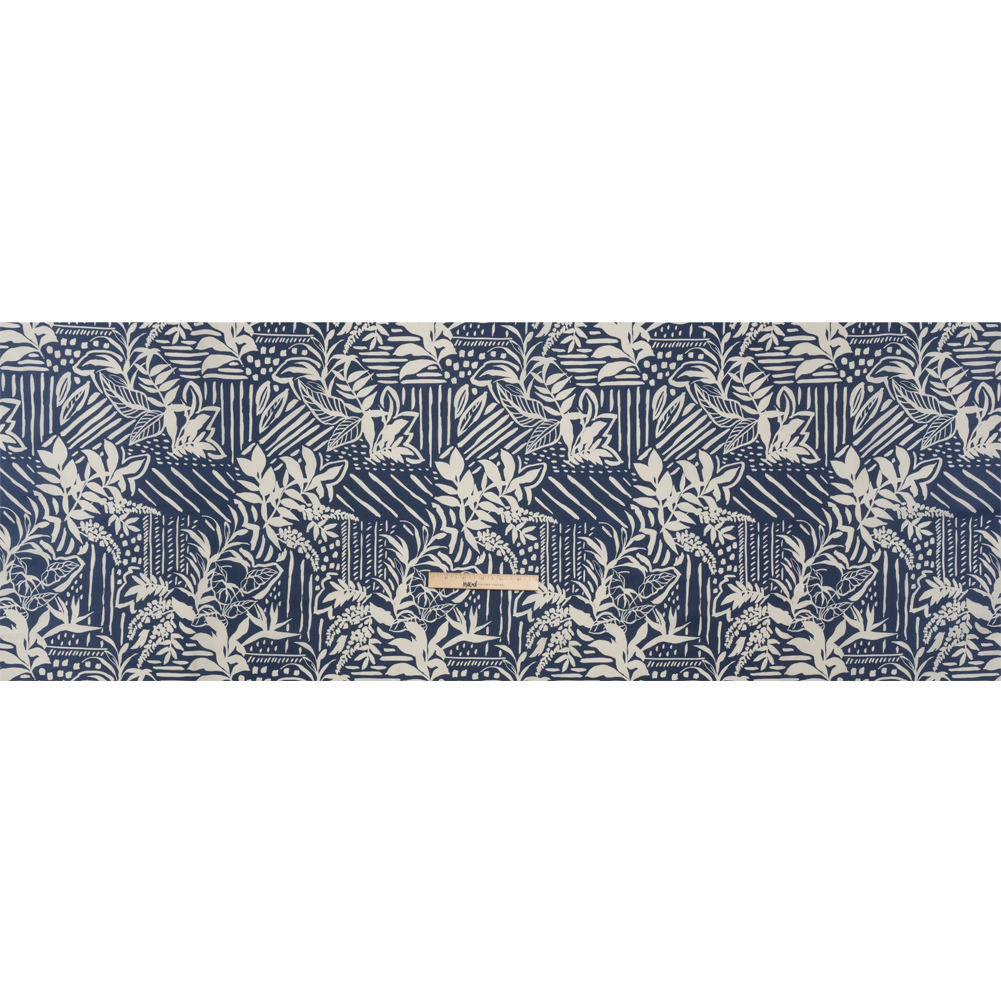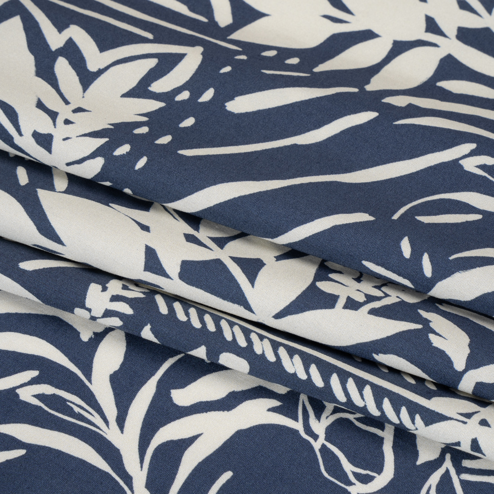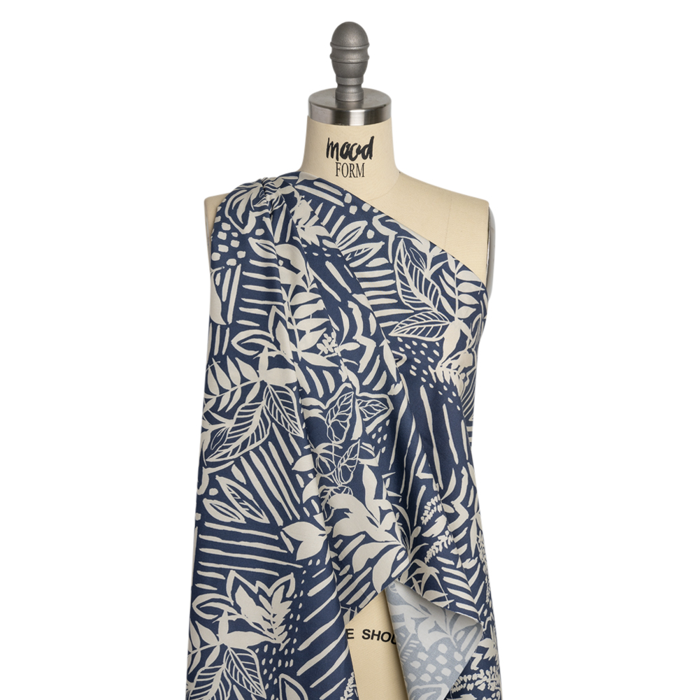 Whether it be the crashing waves or the rustling leaves, our Mood Exclusive Of the Maritime Stretch Cotton Poplin is soundtracked by a maritime melody. Off-white silhoutettes of tropical leaves and flowers grow against a dark blue background. Owning a dry hand, this fabric falls with a crisp drape and features a 25% weft-wise stretch. As it is semi-translucent, a lining may be desired.Warm weather or cold, casual or semi-formal—cotton poplin lends a chic attitude to wardrobes, promoting clean silhouettes and elevated basics. The lightweight and cool feel is great for shirting; boxy cropped tops, button-ups, and shirt dresses are just the beginning of what you can create with this fabric! Our seasoned sewists suggest pre-washing the fabric, securing it with pins and weights to prevent slipping, and using your sharpest scissors!