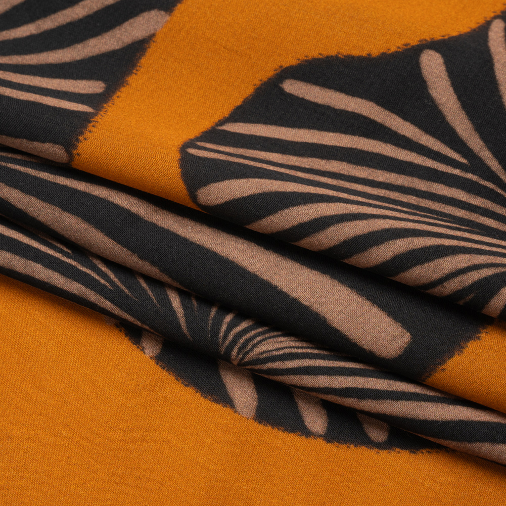 It’s late September and, under the autumn sun, our Mood Exclusive Orange Maggie's Medallions Striped Viscose Dobby flashes its golden hues. Long tan petals extend from the center of black medallions that cover an orange face. Created on a special loom, dobby fabrics feature small, woven details. Upon a close examination of this specific dobby, small lines can be seen running vertically across the lustrous face. Smooth in hand and fluid in drape, this fabric is luxurious for collared blouses, elegant dresses, flowy pants, and more. Please note that this lightweight fabric is translucent; a lining may be desired for complete opacity.