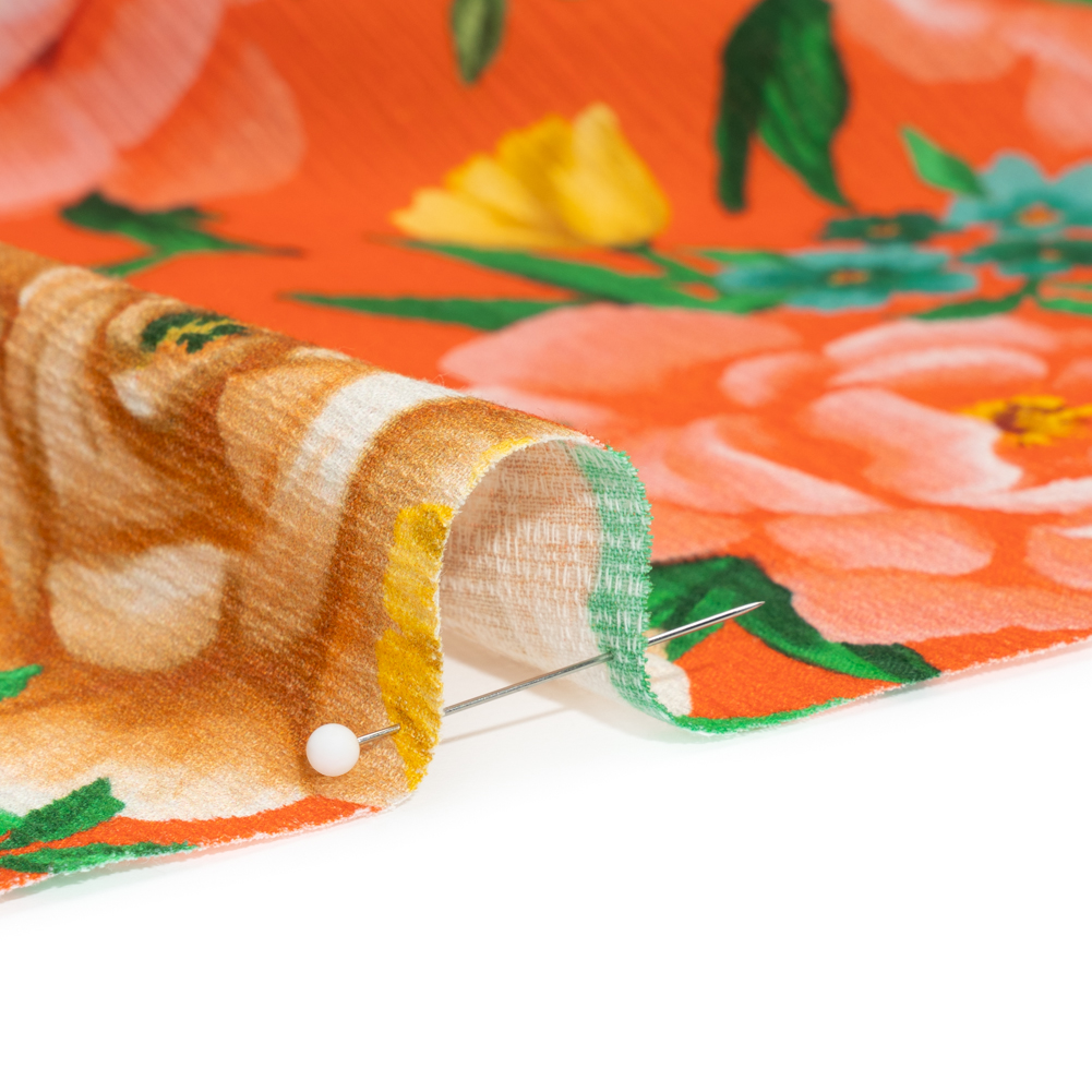 In the first moments of daylight, petals rise with the sun, casting a soft allure over our Mood Exclusive Orange Rose Dawn Slubbed Gauzy Cotton Woven.