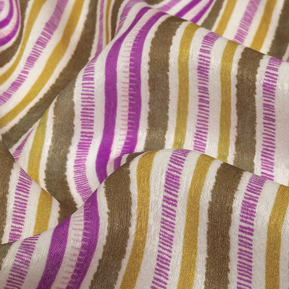 Like a community coming together, the seemingly disparate stripes of our Mood Exclusive Orchid Banded Together Polyester Crepe de Chine join into one unified, sumptuous pattern.