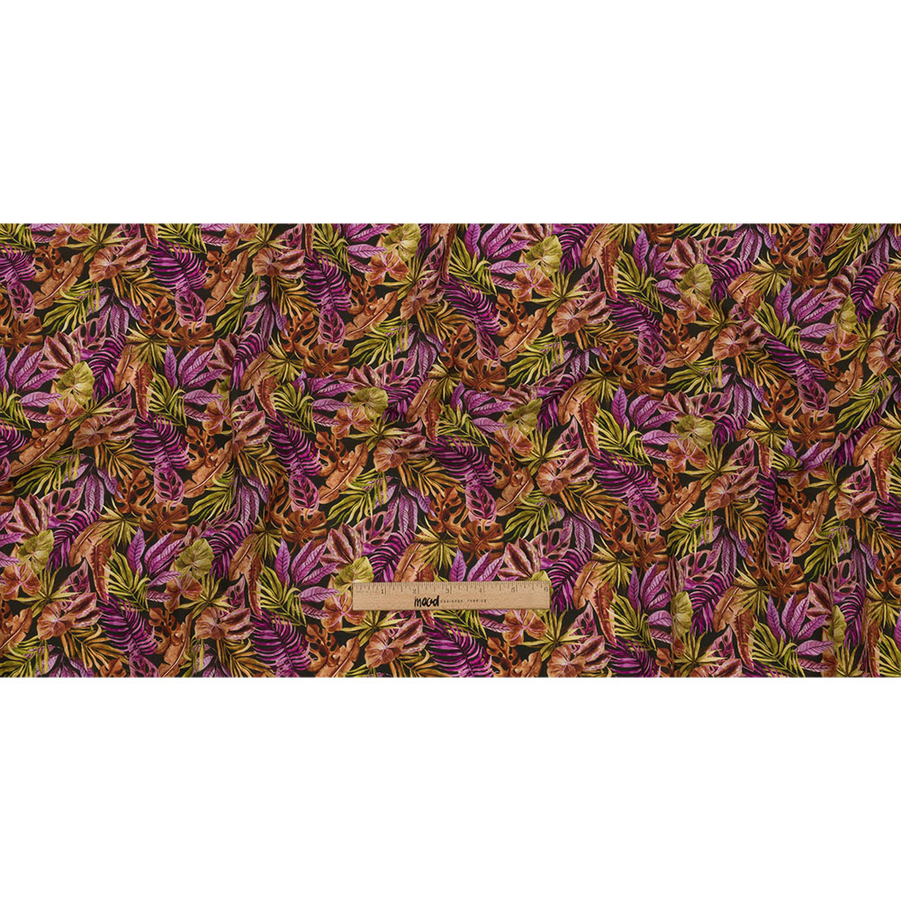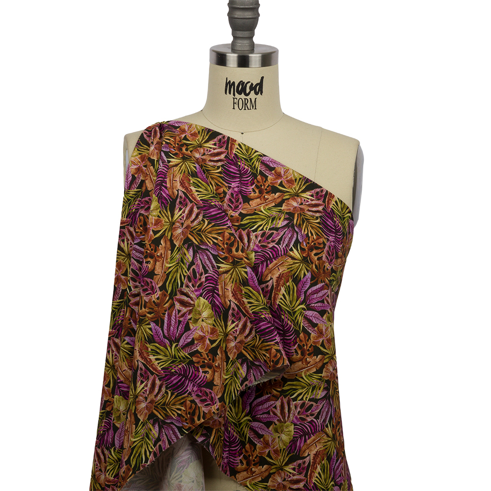 Take a trip to paradise with this Mood Exclusive Paradise Valley Viscose Shirting. Golden brown, pinkish violet, and olive green tropical leaves spread and sway over a black background. With a smooth, crisp hand and flexible drape, design circle skirts, flared dresses, balloon-sleeve blouses, and headscarves. Mostly opaque and without stretch, a lining can be used for structure if desired.