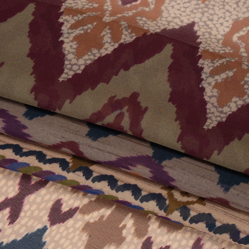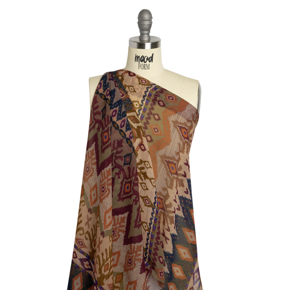 Rooted in the ancient practice of woven art, our Mood Exclusive Pink Land and Sky Viscose Chiffon finds its muse in the blooming fields of summer. Zig-zagged sections display simple, repeated designs in shades of berry purple, green, pale pink, navy, and black. This 100% viscose fabric has a grainy feel that, along with its translucent and lightweight nature, is a characteristic of chiffon. The airy drape flirts with the breeze, romanticizing silhouettes of formal and semi-casual wear alike; create overlays for long gowns and pleated skirts, pair with a lining to create opaque blouses with sheer puff sleeves, and more!A tip from our sewists: Do not feel intimidated by sewing this delicate fabric; using a rotary cutter (or sharp scissors), fine needles, pattern weights, tight stitching, and French seams, anyone can master chiffon!