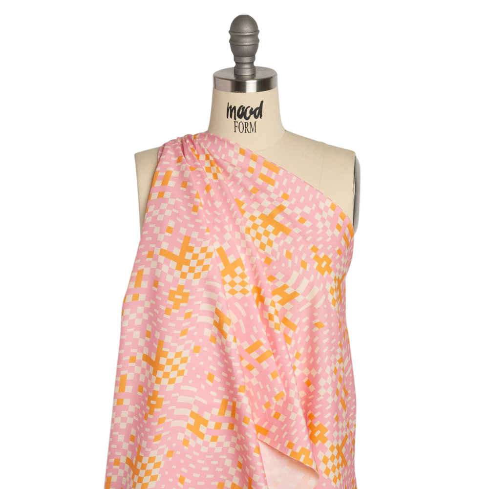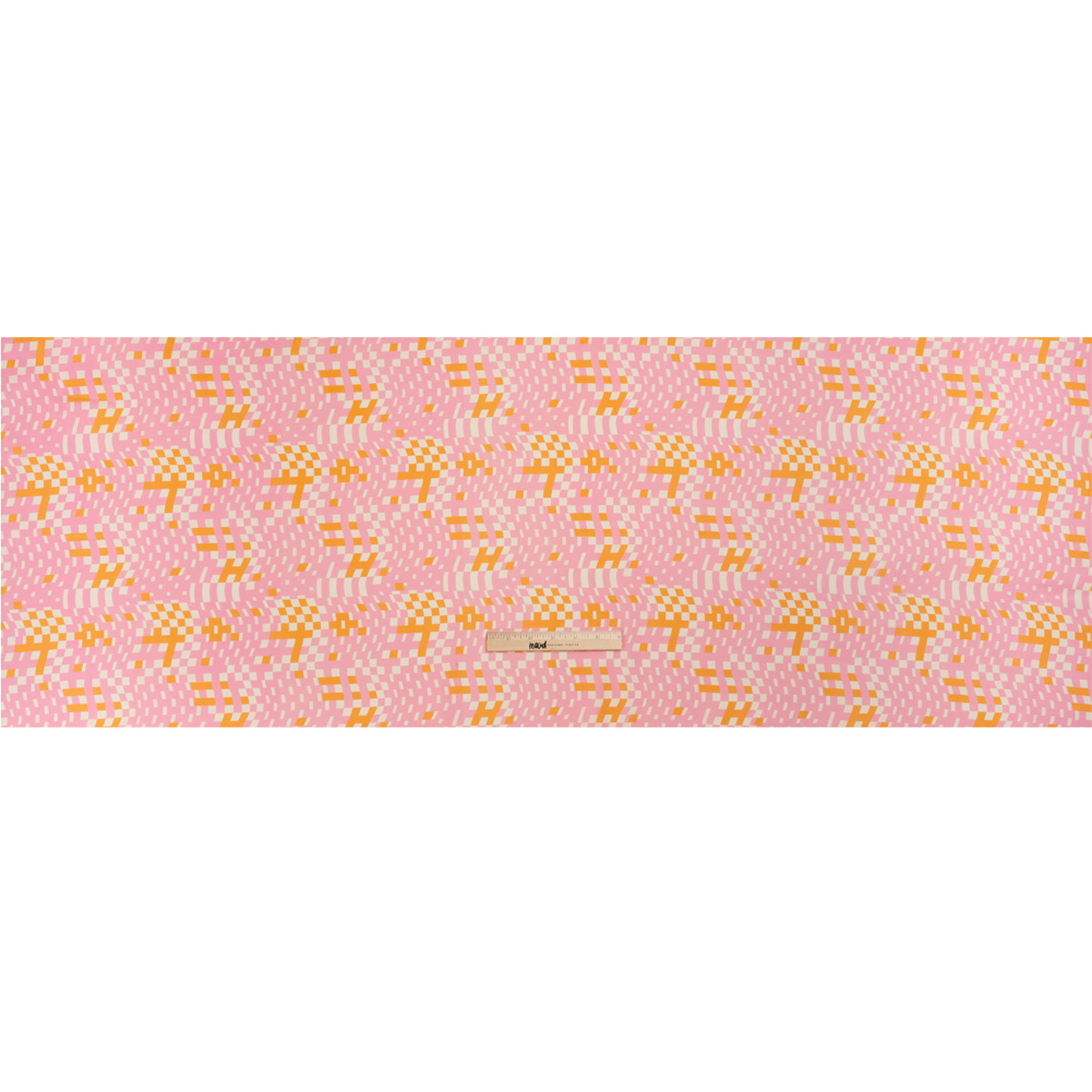 Stay cool, stay groovy, and above all: stay wavy, baby! Our Mood Exclusive Pink Stay Wavy Baby Stretch Cotton Poplin breathes its lackadaisical energy into your everyday life. Groove to the motion of pink and orange checkers as they calmly bend and wave over a cream background. This fabric has a dry hand, malleable drape, and 25% weft-wise stretch. Move in comfort throughout your day with cotton poplin pedal pushers, boxy midriff tops, or chic shirt dresses! While mostly opaque, a lining will increase modesty and add structure to accomplish your desired silhouette.