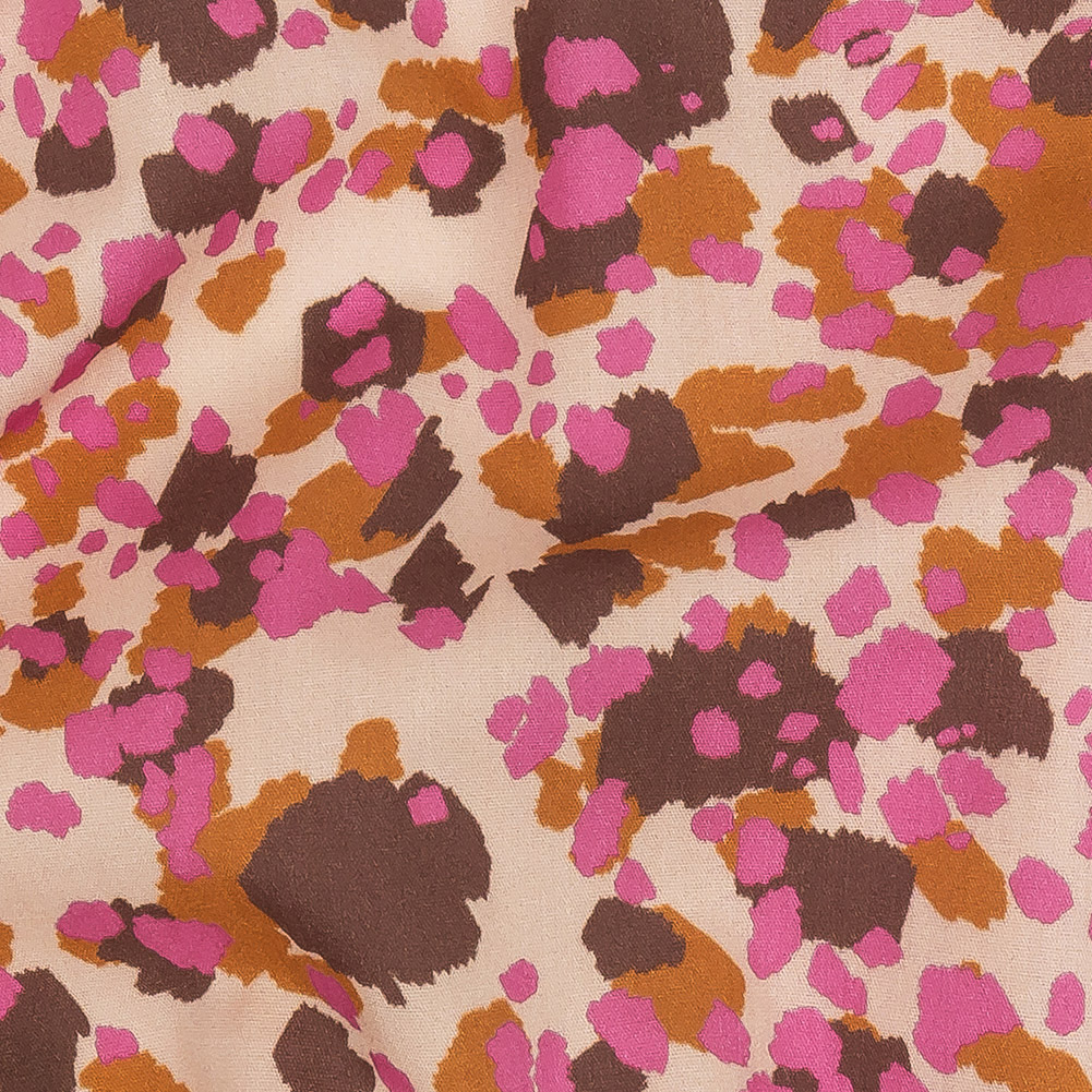 Our Mood Exclusive Pink Sunspot Soul Cotton Poplin is good for the heart! Cocoa brown, warm tan, and bright pink painterly spots overlap to create a dappled effect, like light shining through leaves overhead.