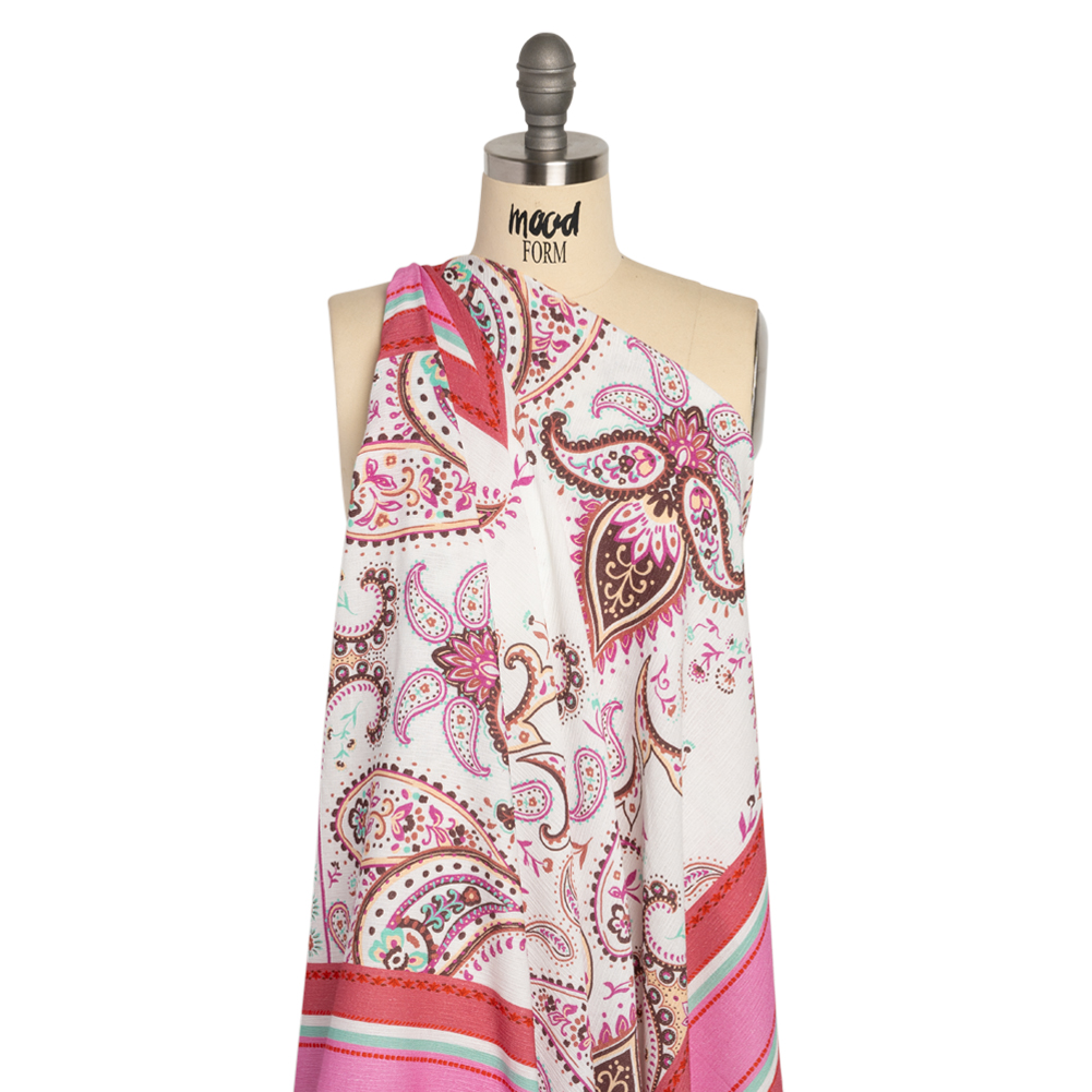 Usher a fresh feeling of whimsy into your wardrobe with our Mood Exclusive Pink Whimsical Wardrobe Slubbed Gauzy Cotton Woven Panel! Framed by thick borders, long rectangular windows display arrangements of hot pink, maroon, pale yellow, and teal paisley and floral motifs. Easy-going energy is emitted from the gauzy hand and slubbed face, sitting cool against your skin even in the warmest of climates. Enhanced by a lightweight drape, this semi-sheer fabric brings a casual feel to wrap blouses, maxi skirts, and sundresses with ruffled sleeves! Depending on the project, a lining may be desired.