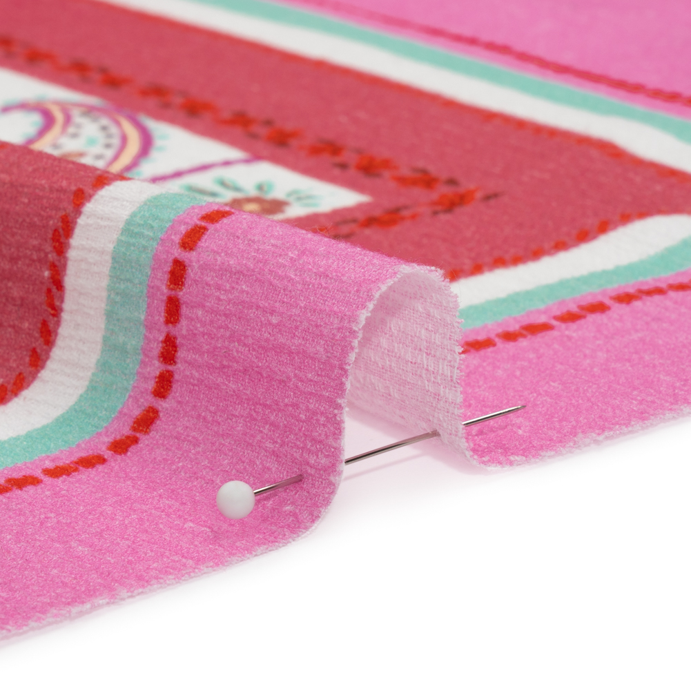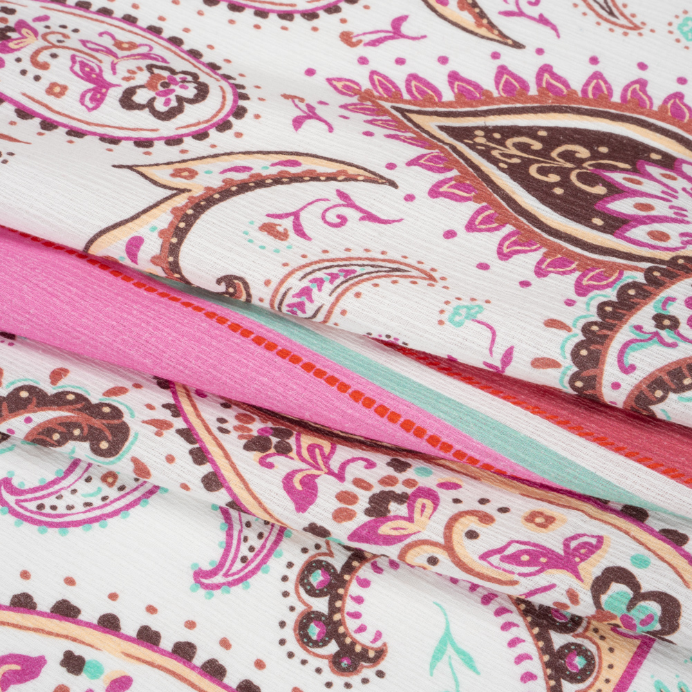 Usher a fresh feeling of whimsy into your wardrobe with our Mood Exclusive Pink Whimsical Wardrobe Slubbed Gauzy Cotton Woven Panel! Framed by thick borders, long rectangular windows display arrangements of hot pink, maroon, pale yellow, and teal paisley and floral motifs.