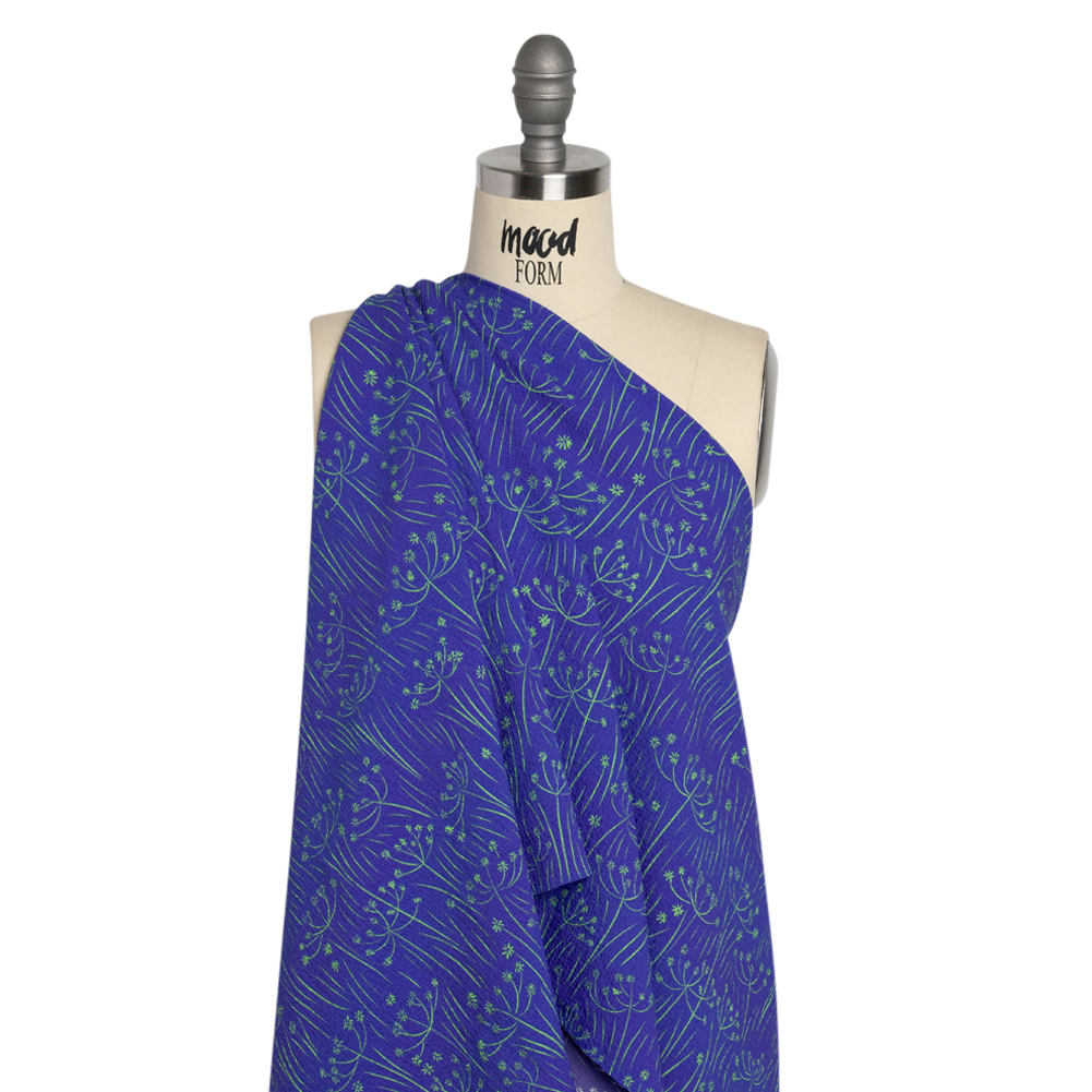 The childhood innocence of making a wish on a dandelion is not lost on our Mood Exclusive Purple Dandelion Dreamer Stretch Polyester Seersucker as lime green seeds carry dreams and wishes through a purple sky.Seersuckers offer a respite from the heat; apart from bringing a unique texture to your everyday and semi-formal garments, the lightweight, puckered face keeps you cool in any climate. Separating this specific seersucker from the rest is its 10% weftwise stretch, a bonus element that boosts its comfort from ahh to ahhhhhh. With its supple drape, create suit jackets, blouses, pinafore dresses, collared shirts, and more! Depending on the project, a lining may be desired.