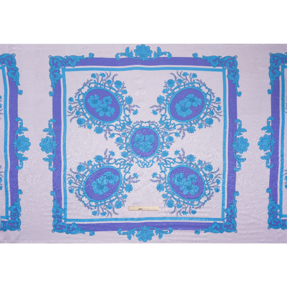 Powder your nose and spritz your fragrance; our Mood Exclusive Purple Eau de Cologne Animal Rayon Jacquard Panel sets you up for a night of beauty. A purple frame, decorated with turquoise scrolls, borders ornate mirrors reflecting and surrounded by turquoise flowers. Raised cheetah spots decorate the face of this eco-friendly fabric, bringing just the right amount of animal print to your formalwear looks. They texture the sleek hand with a subtle dimension, catching the light with an elegant luster as well.Thanks to their complex weave, Jacquards are lauded for keeping the little details in mind as they elevate looks and turn heads. Feeling cool against your skin and falling with a supple drape, this fabric is ideal for dinners in semi-structured blazers and special occasions in dresses. Translucent, a lining may be desired depending on the project. Please note: This panel measures 57" wide by 40" long.
