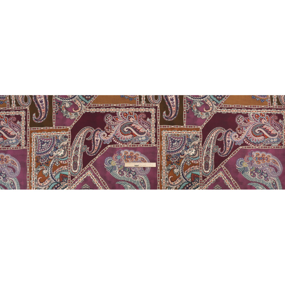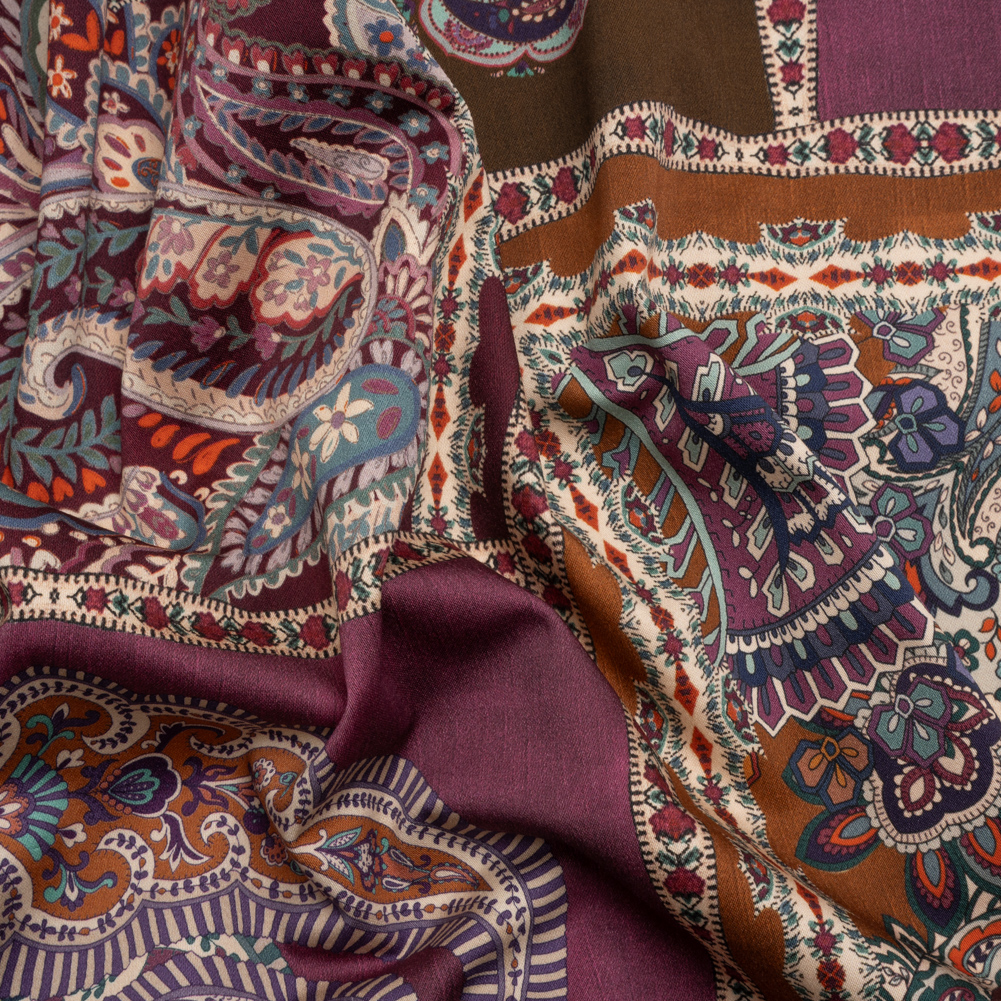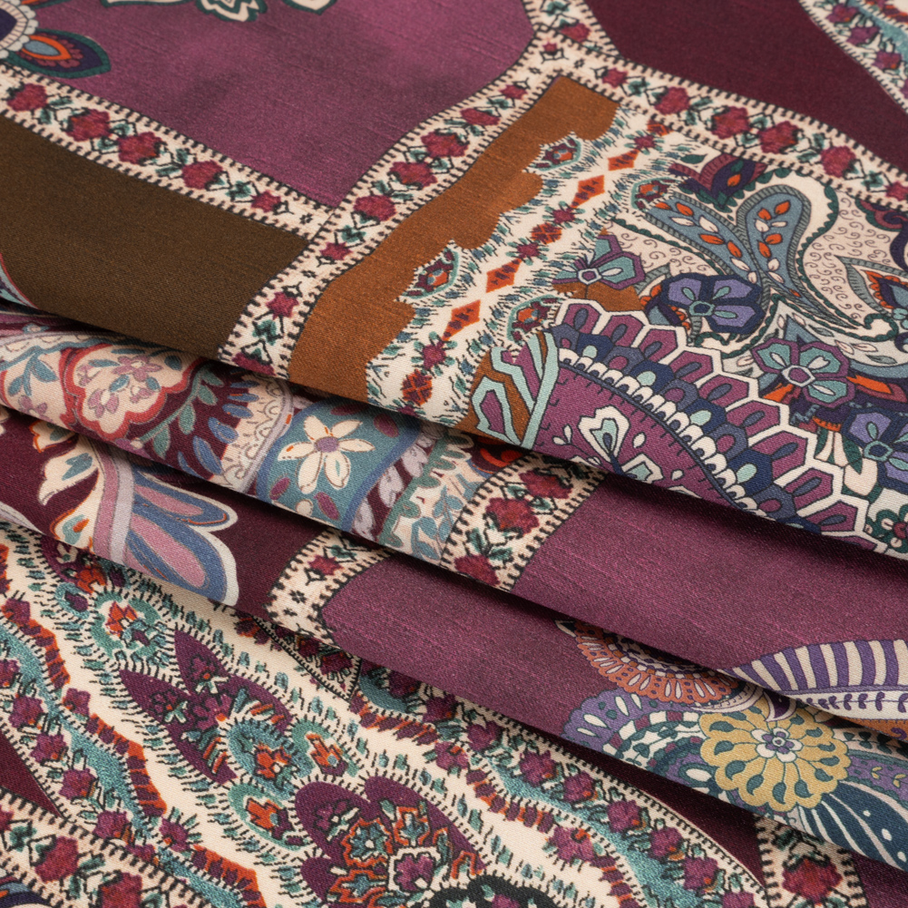 In her lofty mansion full of non-dusty books (they aren't for show, she reads them all), Eloise puts down her tea and reaches for her needle; our Mood Exclusive Purple Elegant Eloise Stretch Cotton Sateen is simply delighted to discover the vision Eloise sees for it. Detailed tendrils and paisleys sprawl across purple and brown patches, framed with lace-like borders that evoke a sense of antiquated ease. Slightly translucent, a lining may be desired for added opacity.Cotton sateen is the perfect balance between relaxed and refined as a dry, smooth hand meets a glossy finish. Lauded for its breathability, this sateen also features a 10% weft-wise stretch to enhance your comfort during your day-to-day. From trousers and wrap dresses to lightweight jackets and A-line tops, the malleable drape offers itself to casual wardrobes in all climates.